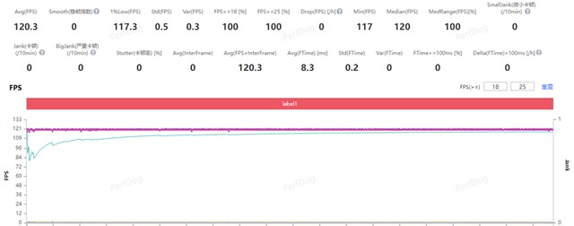 随后我们设置1.5K分辨率搭配120Hz刷新率,连续测试了半小时,《原神》的平均帧率达到了117.9fps,30分钟内仅有6次微小卡顿,没有一次严重卡顿,手机的平均功耗则是达到6.75W。