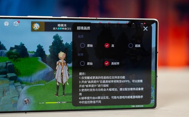打开画质增强,《原神》支持两档画质升级,高画质是1.5K分辨率,超高画质分辨率可以达到2K级别。