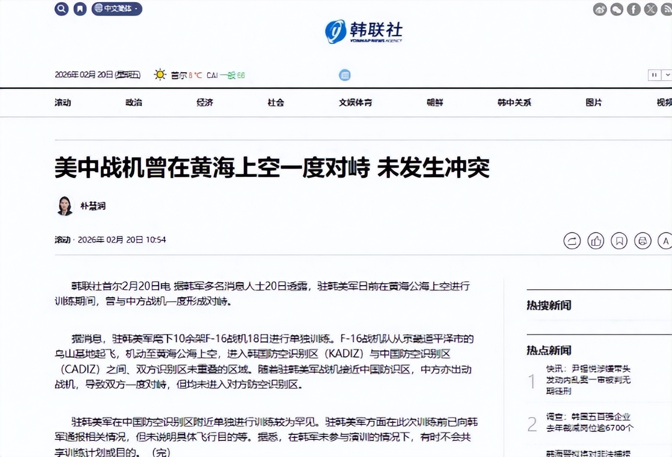 根据韩国军方人士发布的消息,2月20日,驻韩美军10余架F-16闯入黄海腹地,但在几分钟内就被解放军空军发现。双方在公海上发生了对峙,局势一度相当紧张,最终美军机不敌,被驱离出相关区域后返回韩国基地。