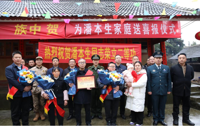 继敖学辉荣立二等功后,播州区现役军人潘本生再获二等功殊荣。2月10日,播州区平正仡佬族乡红心村隆重举行二等功喜报送达仪式,军地领导共同为潘本生家人送上祝贺与敬意。