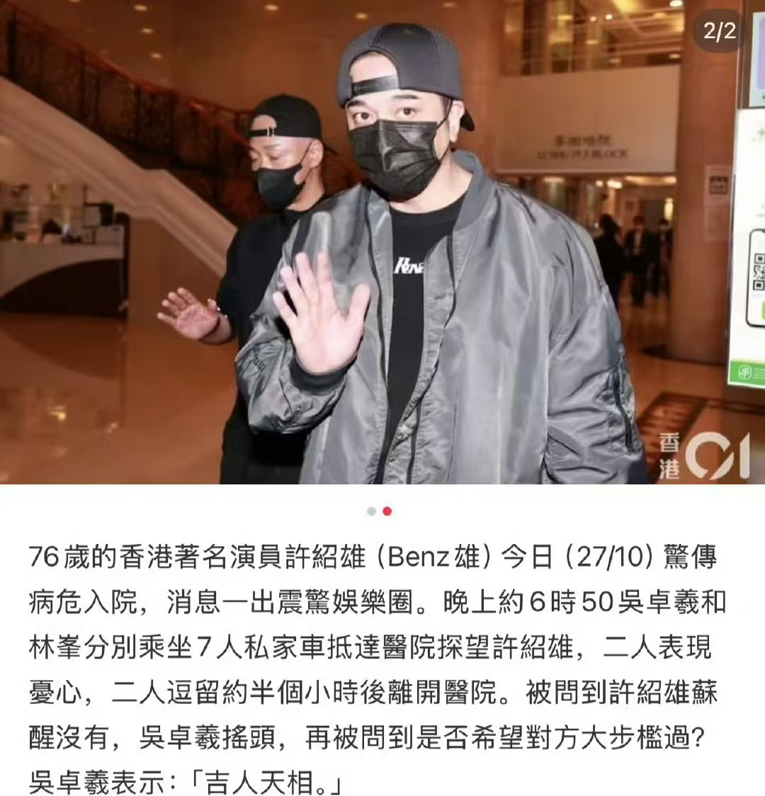 跟许绍雄长期合作的林峯和吴卓羲一起到达医院,两人出来时也接受了记者的采访。吴卓羲说他们见到许绍雄的时候他还没有苏醒,他们都相信许绍雄今次可以大步檻过,吉人自有天相。