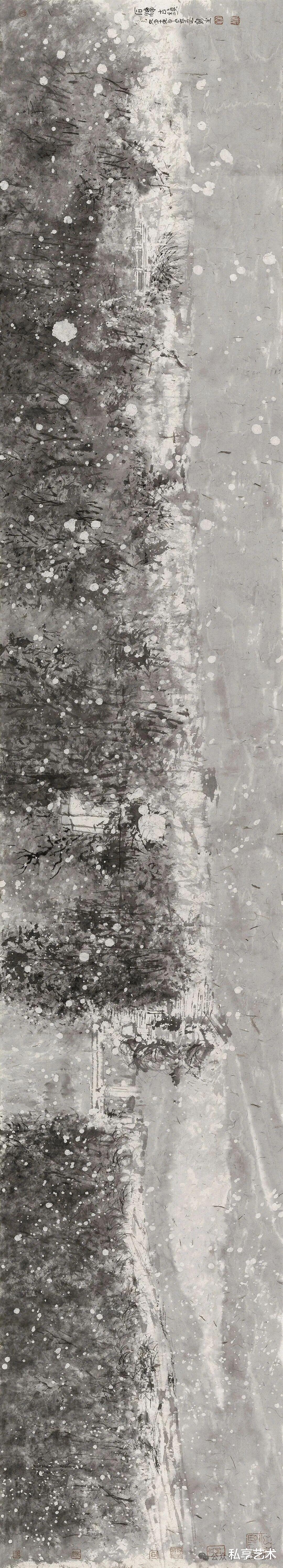 在董金良营造的山水天地中,我们看到了久违的传统气息而不是亦步亦趋的传统图式,感受到徜徉在传统精神中的清幽、简淡、苍茫、浑朴,与之相伴的是士人的情怀、信念的坚守以及隐匿于心的精神标尺。我见过很多画家口若悬河的表述自己艺术上的品味、格调、气息如何、如何,反观画作又让人疑惑其“言行不一”,而要“言行一致”对于画家来说谈何容易,恐怕很多人是“非不想,实不能”。今观董金良山水,无需多言,一派清音雅韵、天趣流淌,这种风神韵采是很多人孜孜以求而求不到的,而在董金良笔下却举重若轻、信手拈来。这是天赋才情,也是自然本性,更是个人修为与技巧锻造的化合。