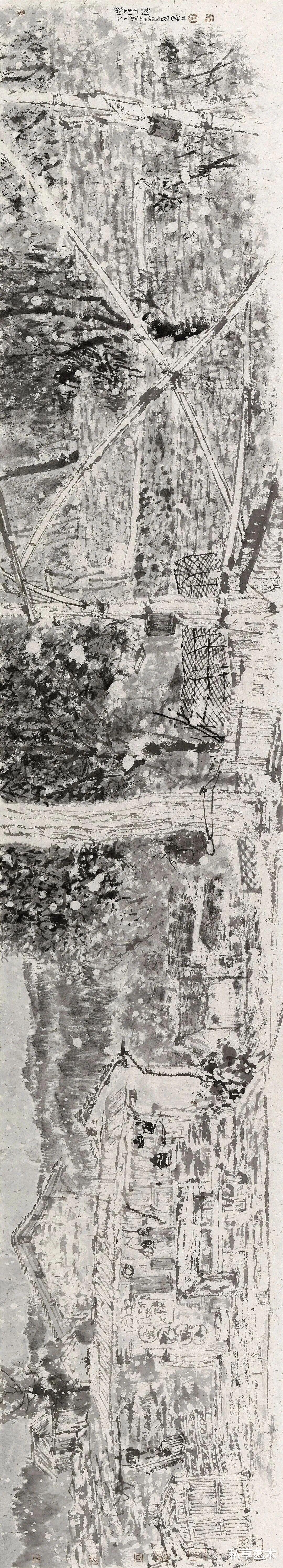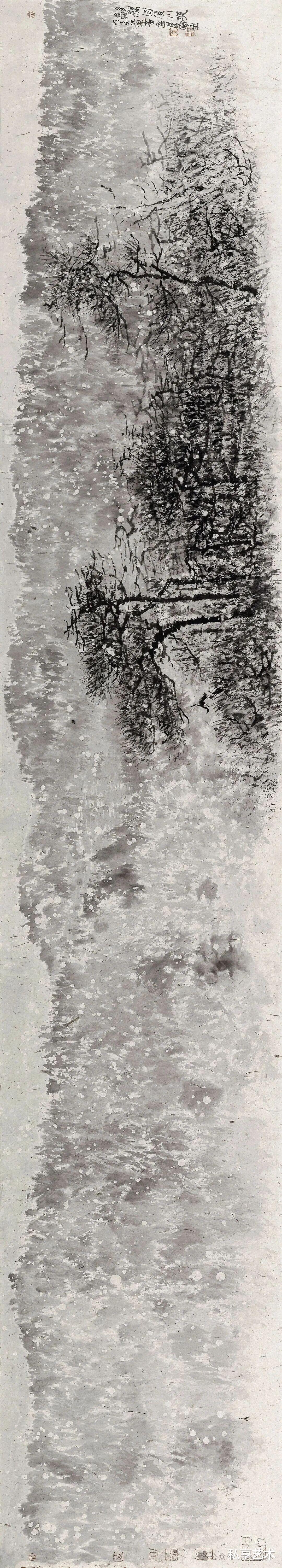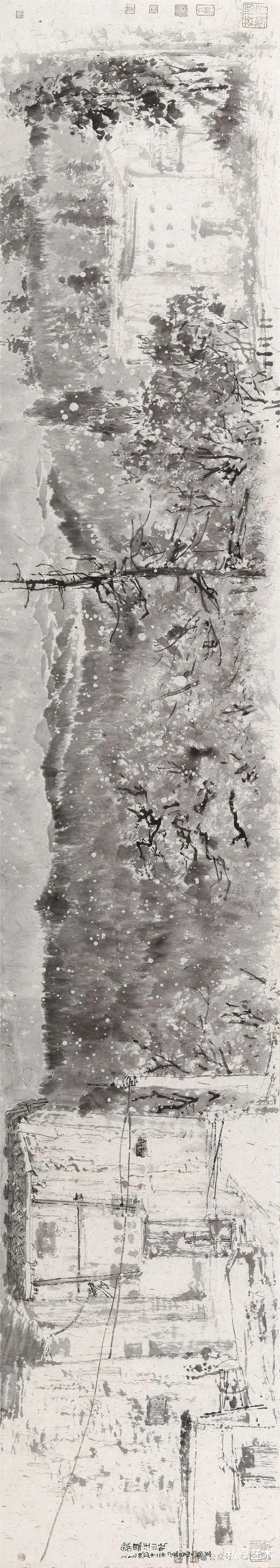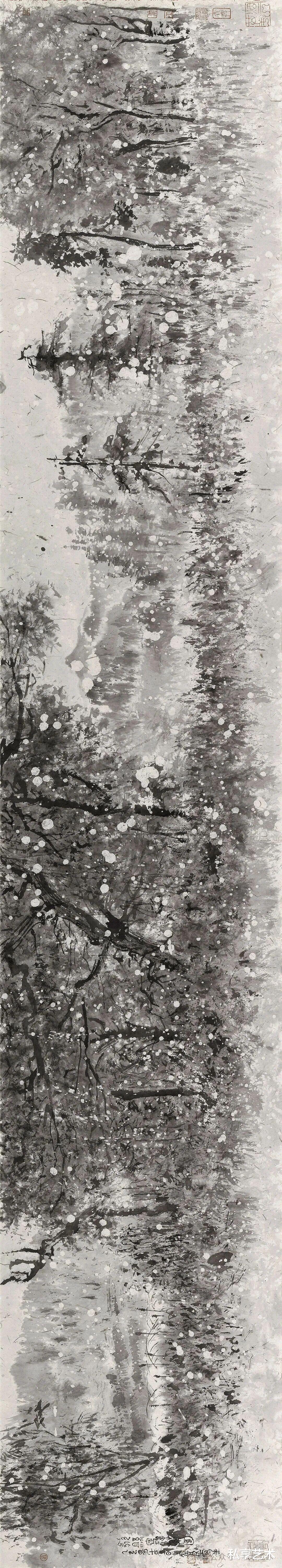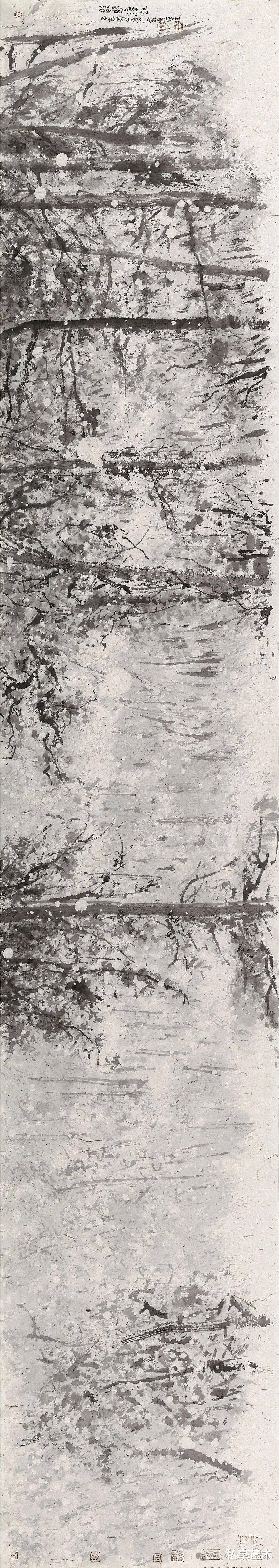 董金良的水墨写生,以苍润笔墨织就林间意趣。枯笔与泼墨相生,枝桠如游龙盘绕,墨点似晨露散落,既得自然肌理之真,又融书写性的洒脱。他把现场的光影、草木的呼吸,都凝进黑白灰的节奏里,让每一幅写生都成了水墨与自然对话的私语笺。