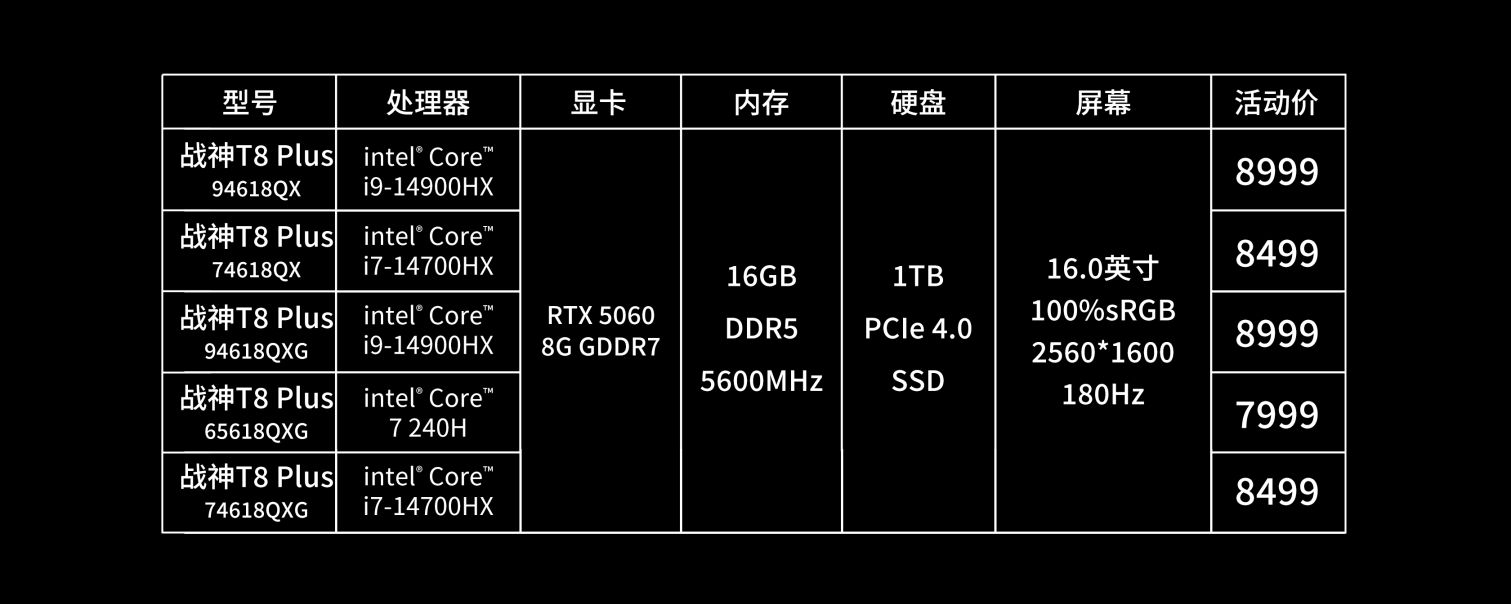 这次的发布会主题也是非常契合全新战神T8 Plus“魔幻青”和“日蚀灰”配色的品位。新品就像一位时尚又强大的战士,不仅换上了靓丽又轻薄的“战衣”,同时在配置上更是六边形战士。一共带来了五款不同的配置组合,分别是: