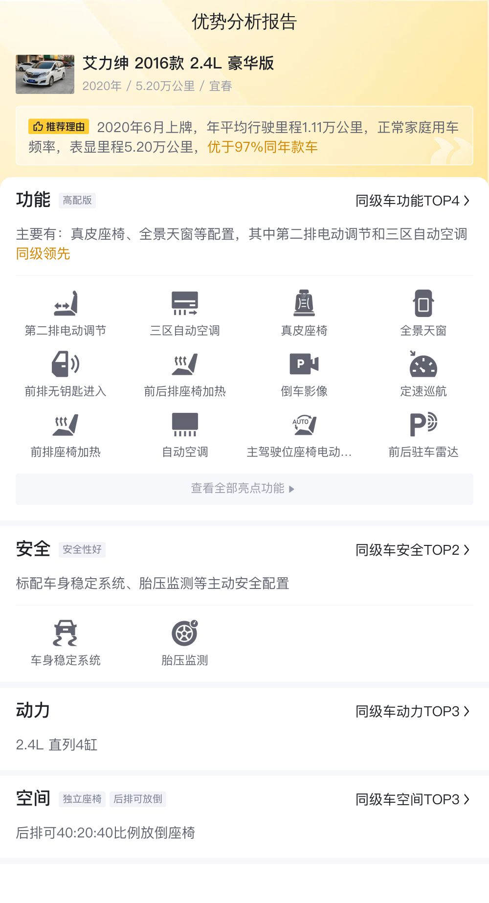我们的主角,艾力绅2016款2.4L豪华版,是一辆白色外浅色内的MPV,上牌地与车源地均为宜春,上牌时间为2020年6月,距今大约已行驶了5.2万公里。该车有过一次过户记录,符合国V排放标准,二手车报价为14.88万元。