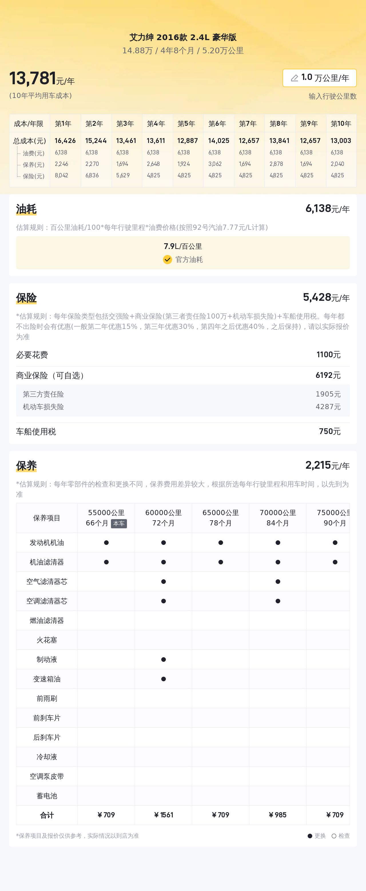 根据懂车帝的数据,目前这款车型的二手车市场行情大致在14.22万至17.76万元之间,而该车的报价为14.88万元,处于相对合理且具有竞争力的价格区间内。关于用车成本方面,我们将从几个关键方面对比分析这款车与同级别车型的日常使用费用。首先,油耗是用车过程中的一项重要支出。根据官方数据,艾力绅2016款2.4L豪华版的百公里综合油耗为7.9升。按照当前油价计算,每年的油费大约为6749元(假设每年行驶2万公里)。其次,保险费用也是每年必不可少的开支。根据估算,这辆车的年度保险费用大约为4798元。此外,车辆的保养维护同样需要一定的投入。预估每年保养费用为1978元。总体来看,艾力绅2016款2.4L豪华版的年均综合用车成本约为1.35万元。