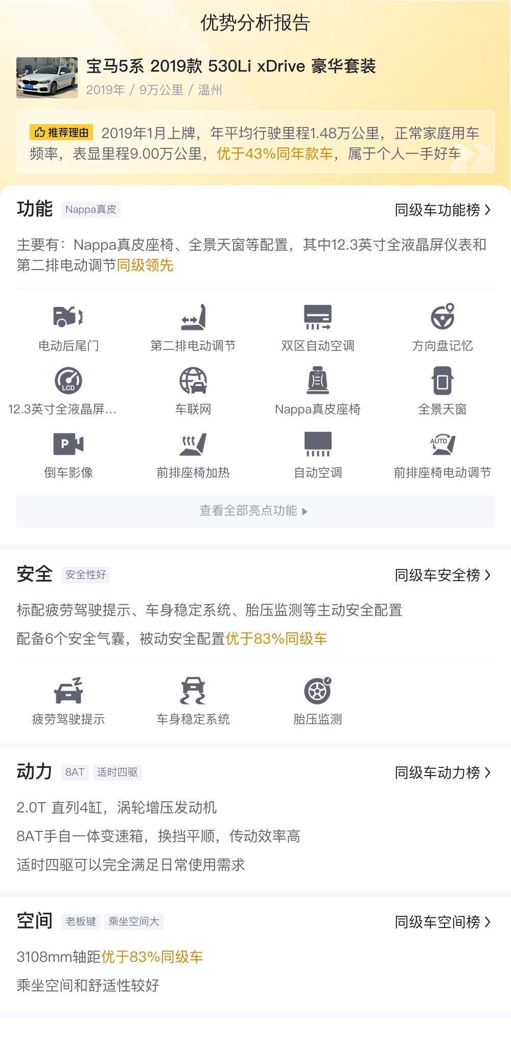 如果您正在寻找一款集豪华、舒适与性能于一身的二手车,那么这辆白色2019款宝马5系530Li xDrive豪华套装绝对是一个值得考虑的选择。它不仅拥有出色的驾驶性能和舒适的乘坐体验,还保持着较高的保值率。当然,购买二手车还需要考虑车辆的实际状况和个人需求等因素,在做出决定之前建议您亲自前往现场查看并试驾车辆。