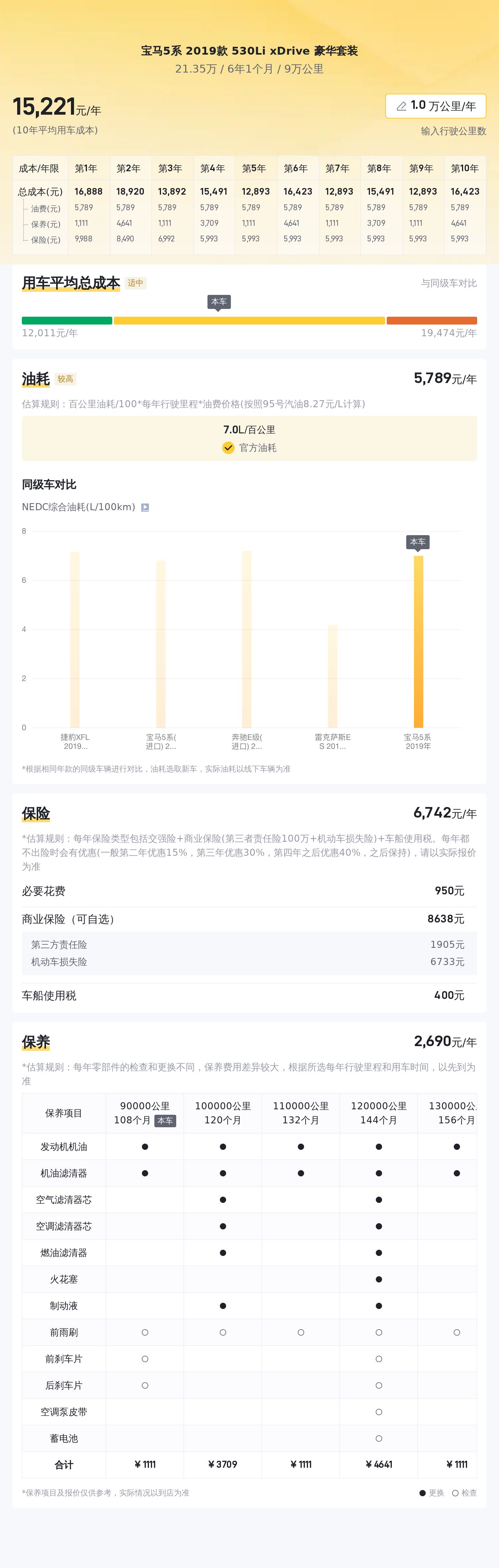 在当前二手车市场中,宝马5系2019款530Li xDrive豪华套装的售价通常在21.65万元至26.15万元之间。然而,这台车的售价仅为21.35万元,相较于市场价处于较低的水平。从保值率的角度来看,该车预计在未来三年内的保值率将高于同级车平均水平。在用车成本方面,根据估算,该车的年均综合用车成本约为1.5万元,这一数字与大多数同级别车型相比处于较高水平。