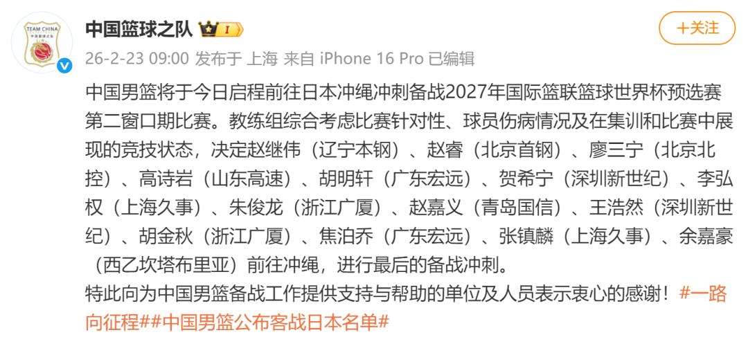然而在开赛前,中国男篮官方突然公布比赛的出征名单。