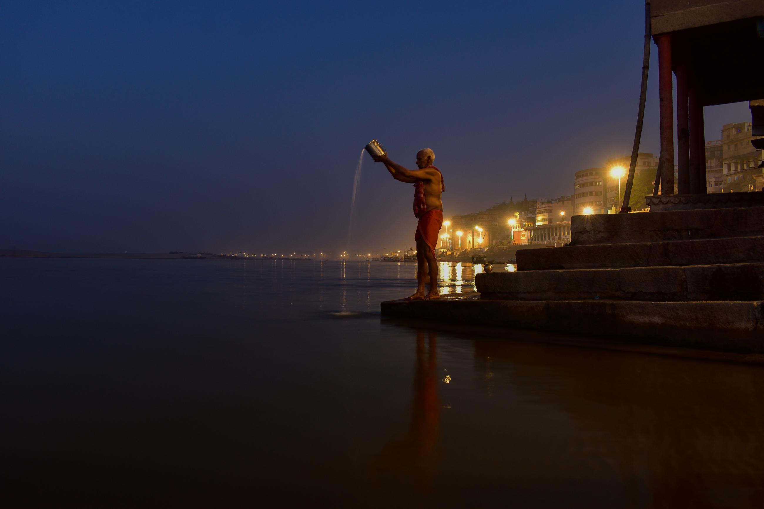 在宁静的晨光中,一名男子在印度瓦拉纳西恒河的河岸上进行神圣的水祭。平静的水面映照着远处城市灯光的柔和光辉,营造出一种宁静而沉思的氛围。这张照片捕捉到了瓦拉纳西的精神精髓,在这里,日常的仪式和祈祷将信徒与神灵紧密相连。