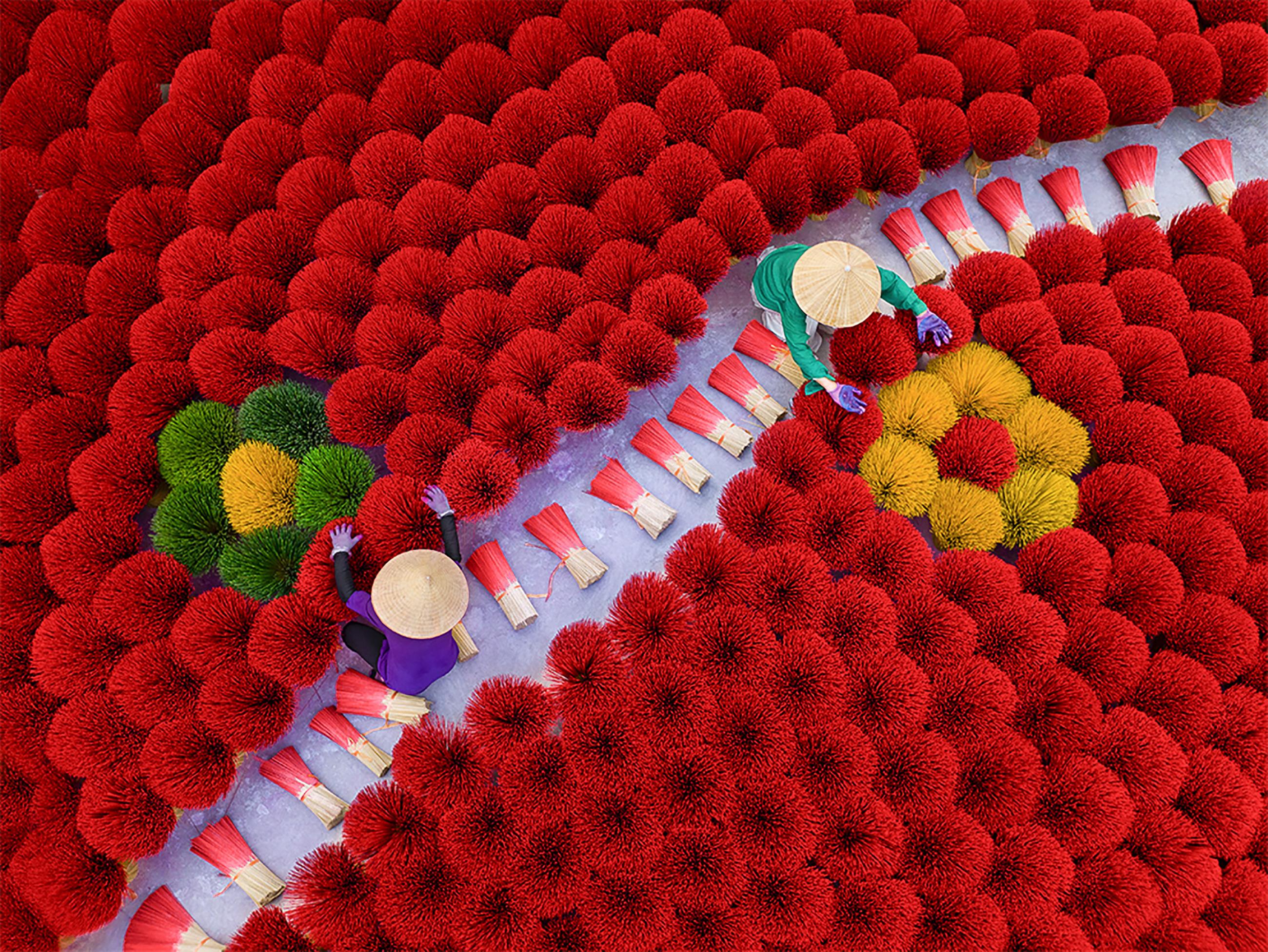 工人们将彩色香料晾干后拿到市场上售卖。这些香料在地上晾干,会形成美丽的花朵形状。根据越南的传统,香料将现世与灵界相连。