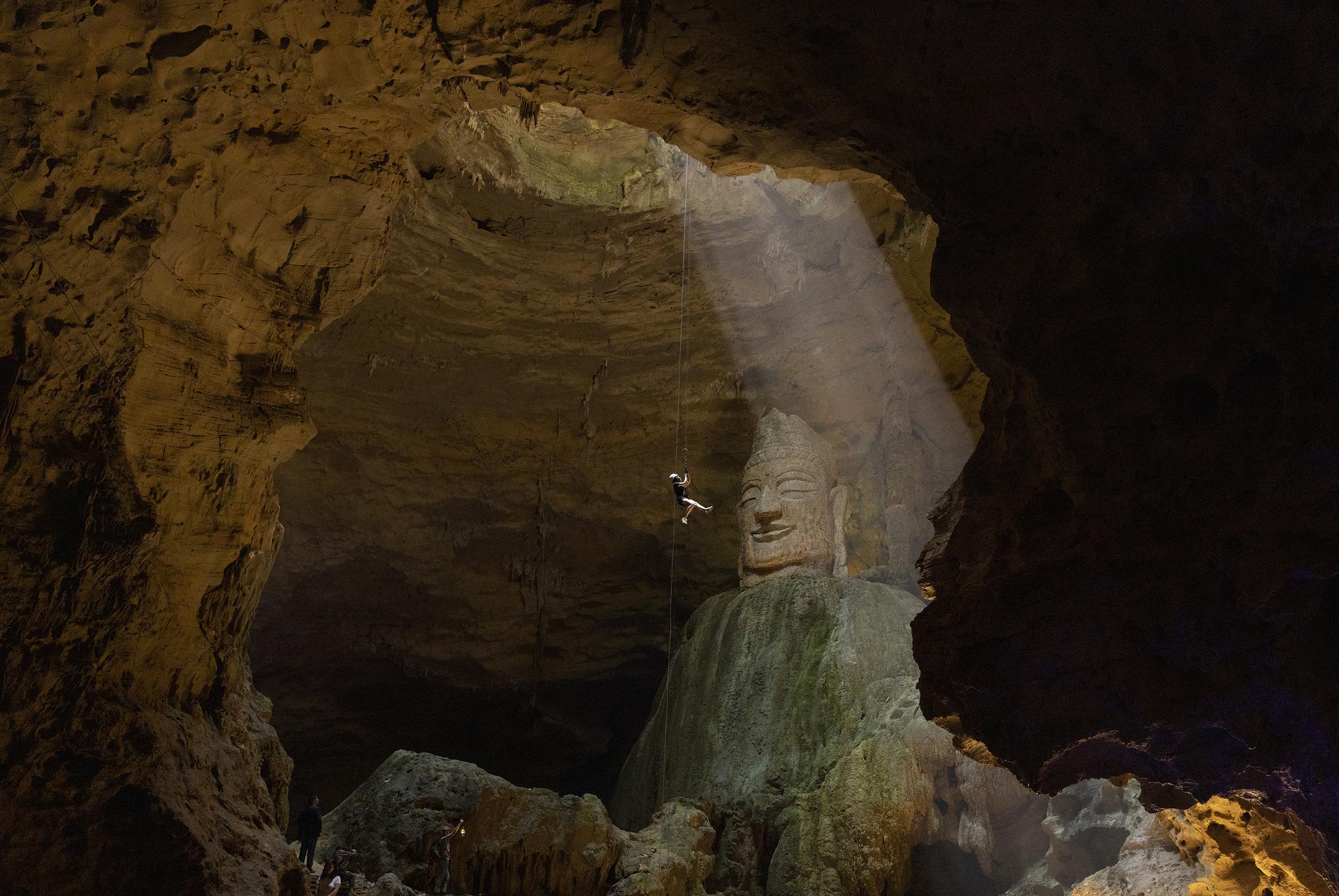 一名游客通过绳索进入中国重庆的天岩洞。这个独特的喀斯特洞穴内有一尊巨大的佛像,吸引了来自世界各地的游客。