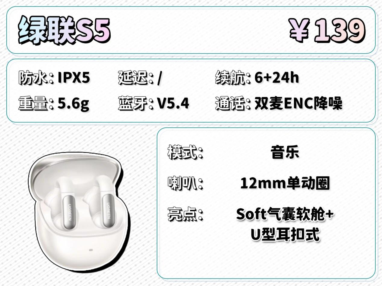 绿联S5在佩戴上采用Soft气囊软舱与U型耳扣式设计,能缓冲压力,钩挂更稳当,5.6克单耳重量适中,长时间佩戴也能保持稳固。在音质上,12mm单动圈单元配合低频增强算法,声音表现中规中矩,能满足日常听个响的需求。在性能上,具备基础防水能力,总续航约一两天一充,支持一拖二连接,不过通话清晰度在嘈杂环境中可能受影响。虽然音质表现和续航不算长,但它提供了稳固舒适的佩戴体验。适合预算有限、看重佩戴稳固性的入门用户选择。