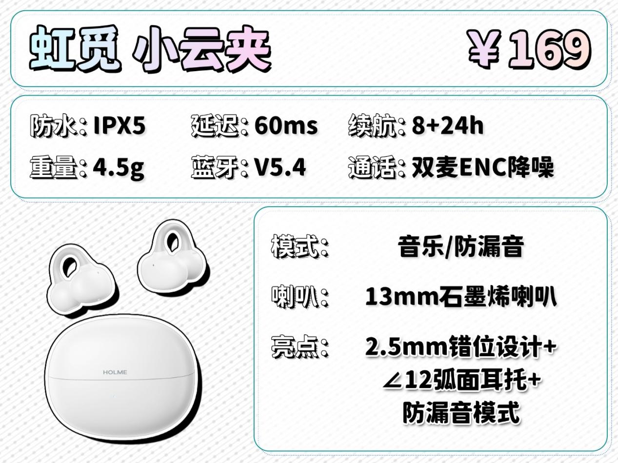 虹觅小云夹可以说是百元档里性价比表现最突出的耳夹,它在佩戴上采用了2.5mm的错位设计与12°弧面耳托的设计,能紧密贴合耳廓,结合4.5g的超轻机身带来久戴无压力的体验。音质上配备了13mm的石墨烯振膜,这种材质有更强的韧性,让声音细节更清晰,还有H-zone全景空间音效,让声音的空间感更强,听感上更加自然,远超同价位的其它耳夹。性能上支持实用的防漏音模式与HBC智慧双联,续航可满足全天使用。虽然外形设计较为简洁,但有着佩戴舒适、防漏音强的均衡体验,是百元档兼顾通勤、学习的高性价比之选。