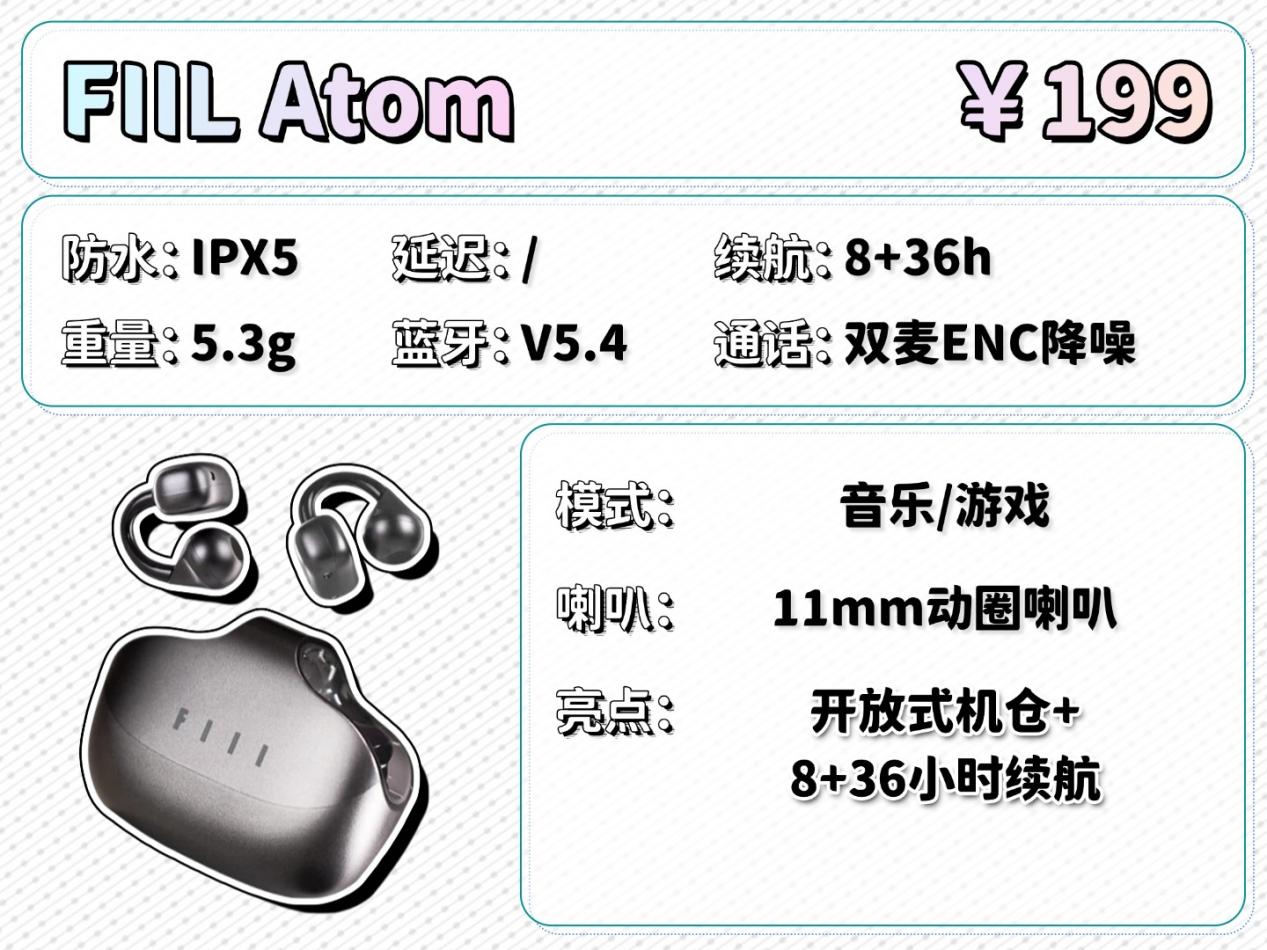 FIIL Atom在佩戴上采用弧形桥设计,机身重量适中,不过整体舒适度较为一般,长时间使用耳朵会有明显存在感。音质上配备11mm动圈喇叭,整体表现中规中矩,但声音清晰,还是能满足日常听歌看视频的需求。性能上支持一拖二连接和游戏模式,切换设备方便,具备日常防水和通话降噪,而且续航特别持久,配合开放式充电仓的设计使用更省心。虽然它的音质和佩戴舒适度不算突出,但还是有着超长的续航和独特的实用设计,是同价位中注重续航与便捷性的选择。