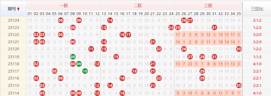 区间分布:本期前区覆盖 01-12(06、09)、13-24(14)、25-35(26、27)三大区间,结束了近期三区(25-35)频繁空开的态势,区间分布回归均衡。