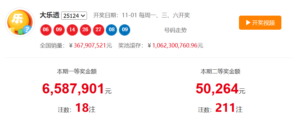 11 月 1 日晚,大乐透第 25124 期开奖结果出炉:前区 06、09、14、26、27,后区 08、09。本期奖号打破近期三区断区趋势,后区连号强势回归,暗藏多重走势信号,下面结合 109-124 期数据深度解析。