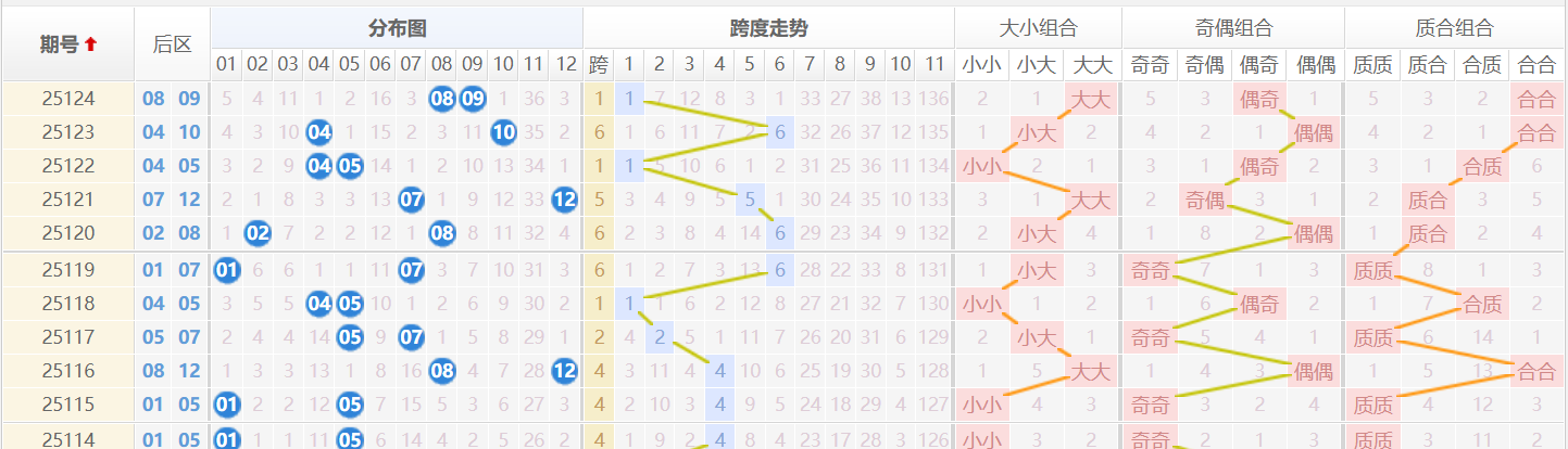 冷热趋势:08 为后区热号(16 期出现 4 次),09 则是温号回升,本期 “大大” 组合(07-12 为大)出现后,下期回归 “一大一小” 主流组合的概率超 78%。