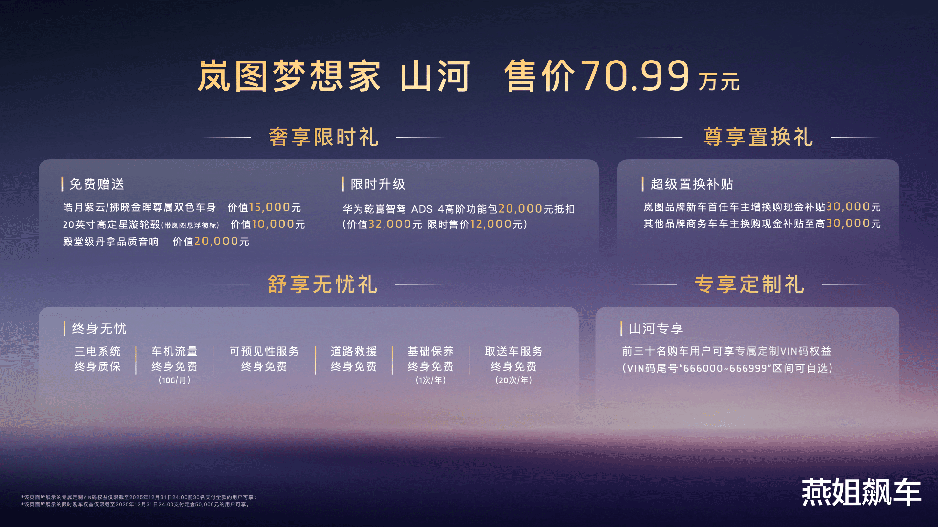 【2025年11月21日 广州】11月21日,广州车展盛大启幕,“新时代旗舰四座MPV”岚图梦想家山河正式上市,售价70.99万元。同步推出山河专属四重礼,包含皓月紫云/拂晓金辉尊属双色车身、20英寸高定星漩轮毂(带岚图悬浮徽标),及殿堂级丹拿品质音响;华为乾崑智驾ADS 4高阶功能包现金抵扣;超级置换补贴;专属定制VIN码权益;三电系统终身质保、车机流量终身免费、道路救援终身免费等权益。