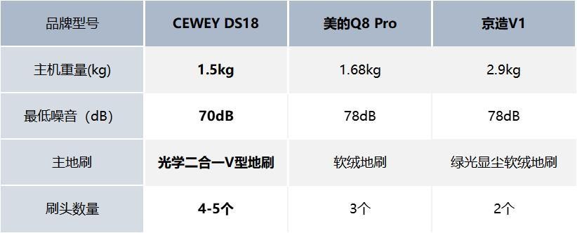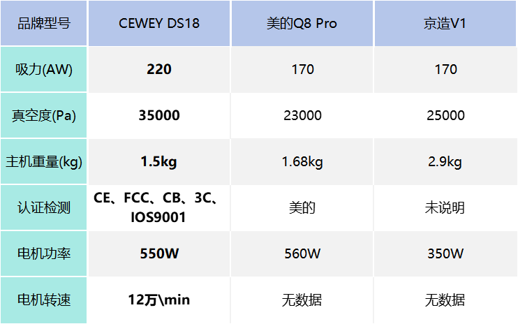 小结:只看吸力参数的话,CEWEY DS18 采用550W无刷电机,标称吸力220AW、真空度35000Pa,账面数值有明显余量,面对硬地颗粒和短绒地毯的细灰都更从容。美的Q8 Pro 的标注通常更保守,倾向稳态输出,峰值不刻意拉高;京造V1 走其他性能的取向,吸力标注相对克制,峰值空间较小。单看参数对比,CEWEY DS18 在吸力与真空度上更占主动,给到的可用余量更宽。