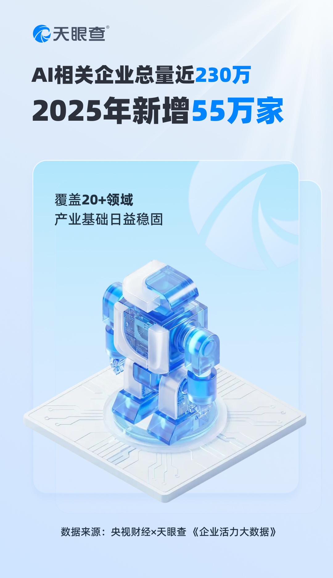 近日,央视财经与天眼查联合发布《企业活力大数据》,数据显示,截至2025年,我国人工智能相关企业总量已接近230万家,其中2025年新设立企业超55万家,较2024年同期增长32.6%。这些企业广泛覆盖智能制造、智能交通、智能医疗、智能安防等多个核心领域,产业基础日益稳固。