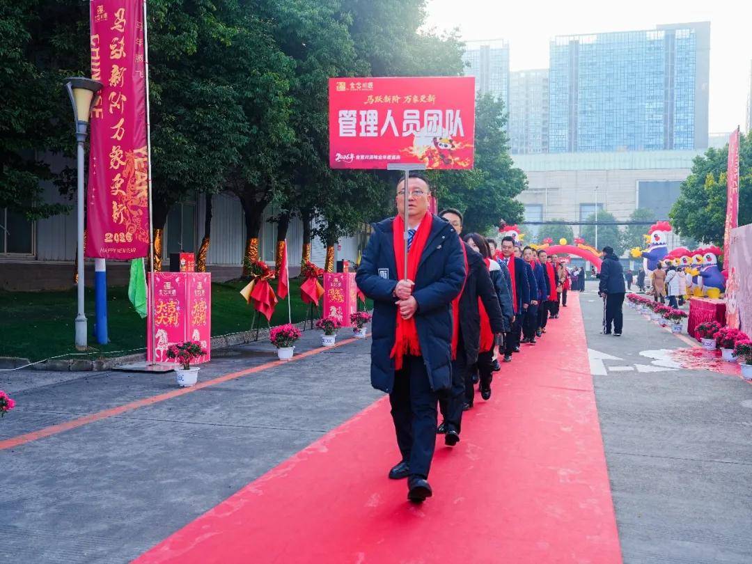 营销职系、生管职系、行政后勤、优秀员工、老员工代表、管理团队及员工家属方阵依次整队入场。步伐铿锵、队列整齐,一支支方阵不仅走出了金宫人的精气神,更走出了企业稳健前行的底气与信心。这既是一次庄重的集结,也是一场属于奋斗者的荣耀亮相。