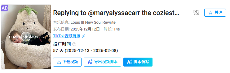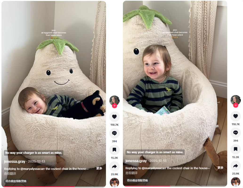而Sweetcrispy品牌的豆袋椅恰好与她十分契合,可爱的外表和儿童适用的标签让这款椅子成功跻身“妈妈好物”列表,也铸就了近860万的视频播放量。