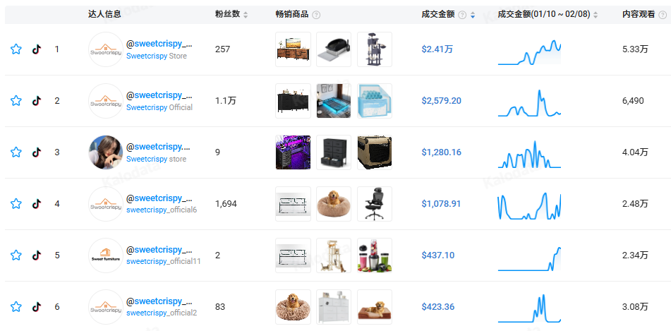 例如,品牌账号@sweetcrispy_store粉丝仅257人,月流量也才5.11万,但销售额却达到了2.41万美元。