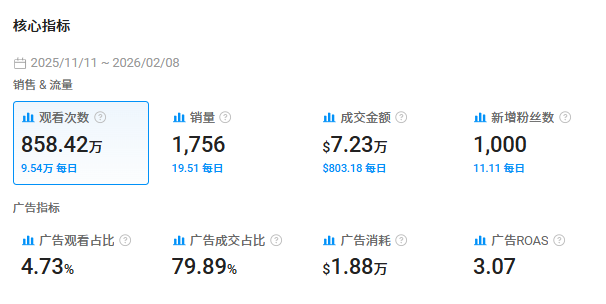 虽然看起来是花了很多,不到两个月就投入了近两万美元,但广告ROAS(投资回报率)却达到了3.07。这个数据,在TikTok家居类目中,已经处于中等偏上水平了。