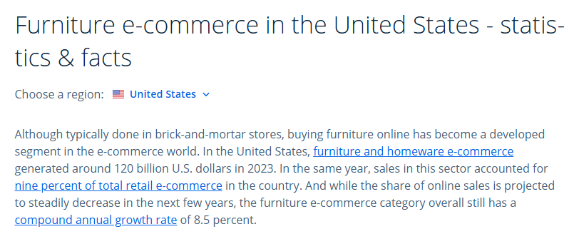 Statista数据显示,2023年美国家具电商市场规模约为1200亿美元,预计到2027年将超过1600亿美元,年复合增长率在5%左右。