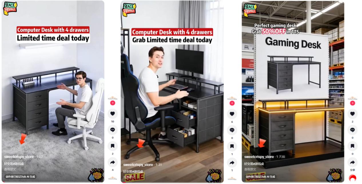 值得一提的是,随着AI视频工具的普及,Sweetcrispy品牌也开始在部分账号上使用AI生成的带货视频。