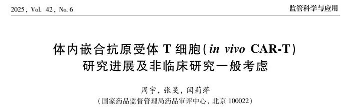 近期,CDE周宇等专家在《中国药物评价》杂志发表题为《体内嵌合抗原受体T细胞(in vivo CAR-T)研究进展及非临床研究一般考虑》的综述文章。鉴于in vivo CAR-T兼具基因治疗与细胞治疗双重属性,涉及病毒、纳米颗粒等多元递送载体,其非临床药理学、药代动力学及安全性评价较传统产品更为复杂,亟须建立科学的监管评价框架。该文基于对全球研发现状的系统调研与梳理分析,首次系统阐述了该领域的非临床研究一般考虑,旨在为研发企业提供技术指引,引发学术界与监管方对关键科学问题的深入讨论。