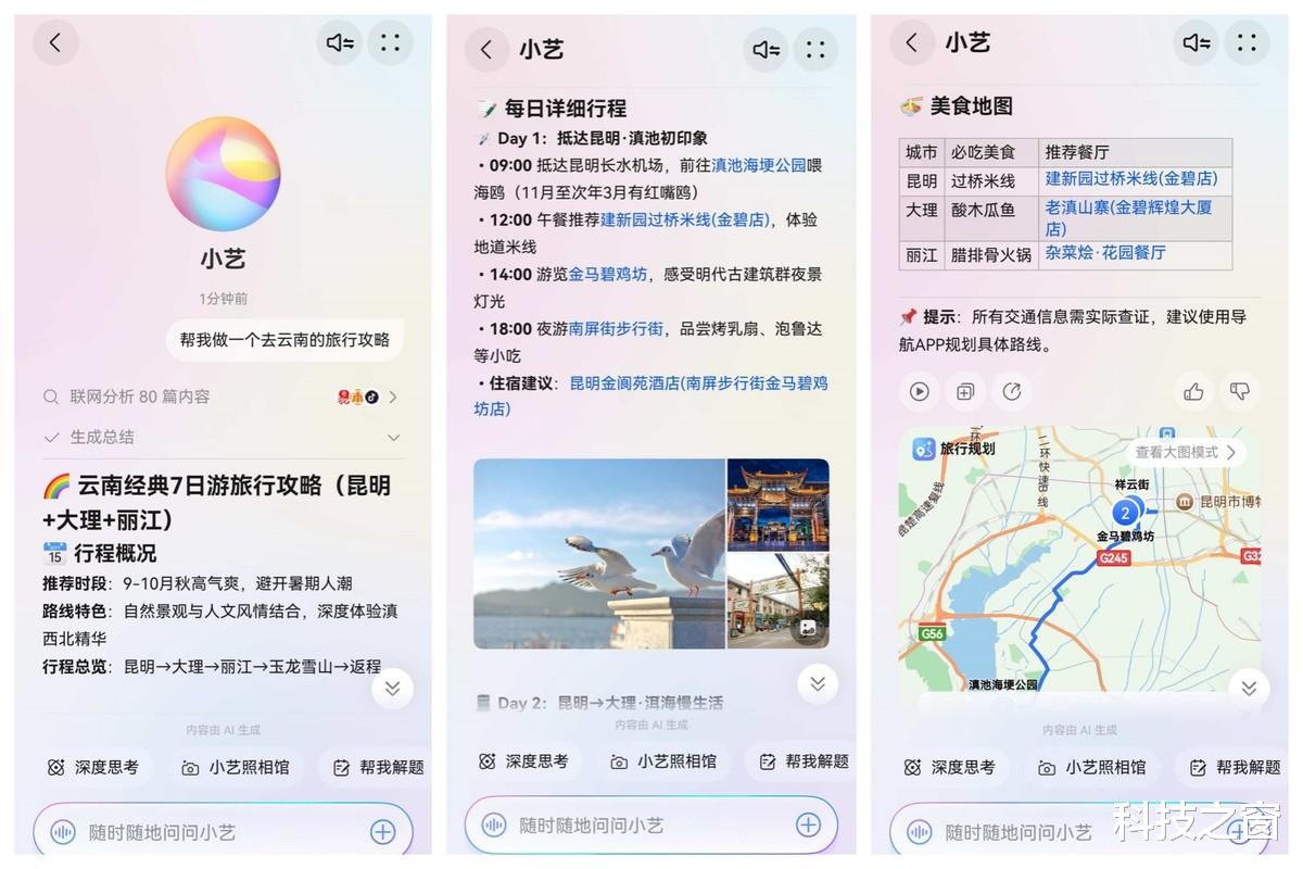 一做计划就头大?强烈建议把假期出行攻略交给给小艺吧……一句“小艺小艺,帮我做一个去云南的旅行攻略”,就轻轻松松把我们要做好几个小时的事情做完了,从路线规划到美食推荐,安排得明明白白…