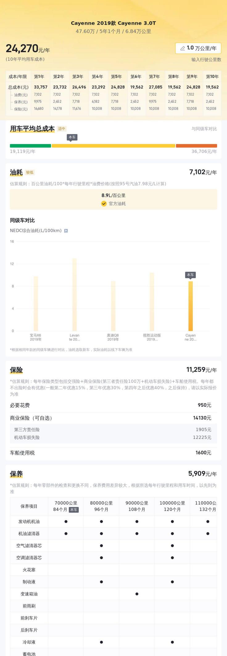 这辆2019款卡宴,行驶里程6.84万公里,过户次数1次,从数据上看车况尚可。但具体情况还需要结合专业的检测报告进行判断。年均2.4万元的用车成本预估,也只是一个参考值,实际费用会因个人使用情况而有所差异。例如,燃油费、保险费、保养费等都会受到驾驶习惯、行驶里程、以及保养方式的影响。