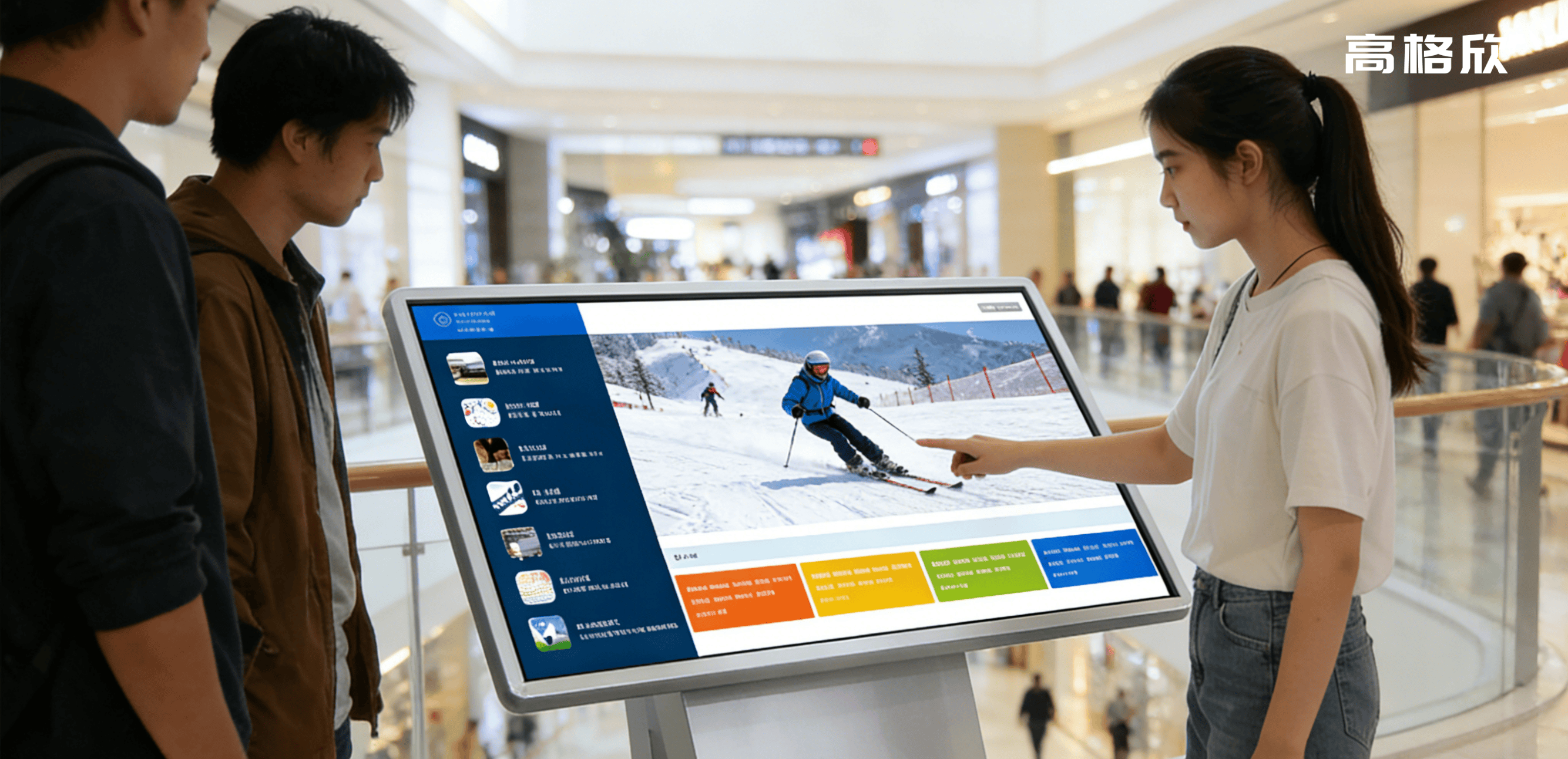 显示配置上,高格欣卧式触控一体机采用京东方IPS硬屏,分辨率高达3840×2160,像素密度达103PPI,搭配全贴合工艺与量子点背光技术,色彩还原度较普通屏幕提升20%,色域覆盖率达110% DCI-P3,能精准呈现产品的细腻纹理、图片的真实色彩、视频的生动细节。无论是商场的商品展示、景区的景点宣传,还是政务的政策解读、校园的教学演示,都能清晰呈现,让信息传递更直观、更有冲击力。