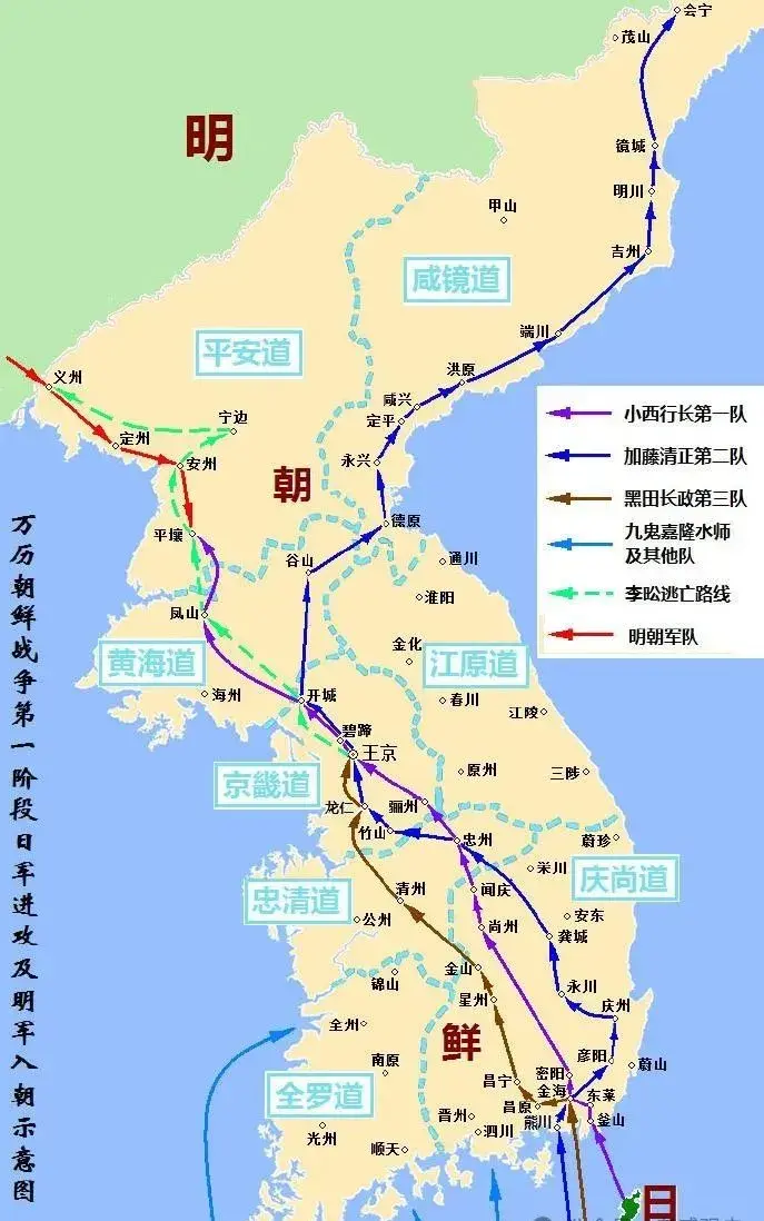 万历年间,日本的丰臣秀吉统一了日本,于是野心逐渐膨胀,于是发兵登陆半岛,想要以朝鲜为跳板,进而侵略大明,当时15万日本兵浩浩荡荡在现如今的韩国釜山登陆,而当时朝鲜的武备松弛,根本不是日本的对手,才一个月就丢掉了朝鲜的首都汉城,也就是现如今的韩国首都,两个月就丢掉了平壤,也就是现如今朝鲜的首都,正所谓三都沦陷,八道瓦解。