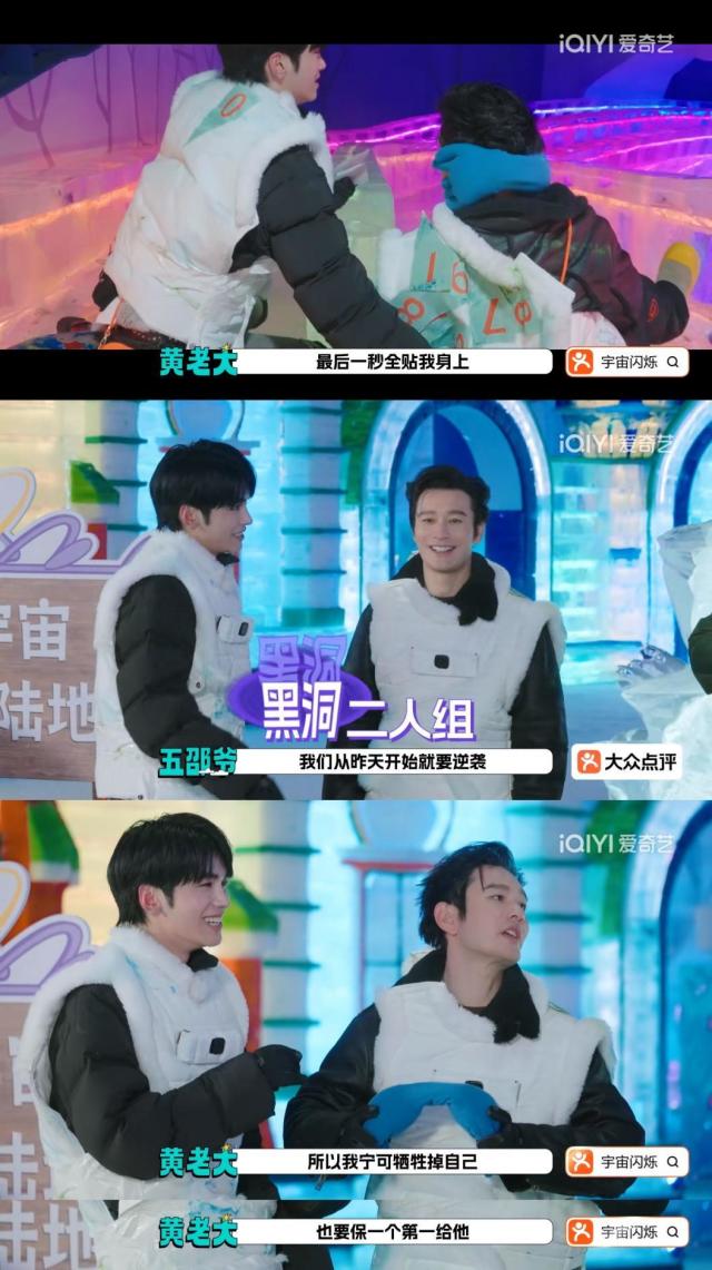 脑力游戏之后等着宇宙爆闪团的是体力竞技游戏,在冰雪大世界玩追击战听起来就刺激,看宇宙爆闪团正式开始雪花数字追击战更是燃到我眼眶发热,怎么个人战还能嗑到这么美味的兄弟情。