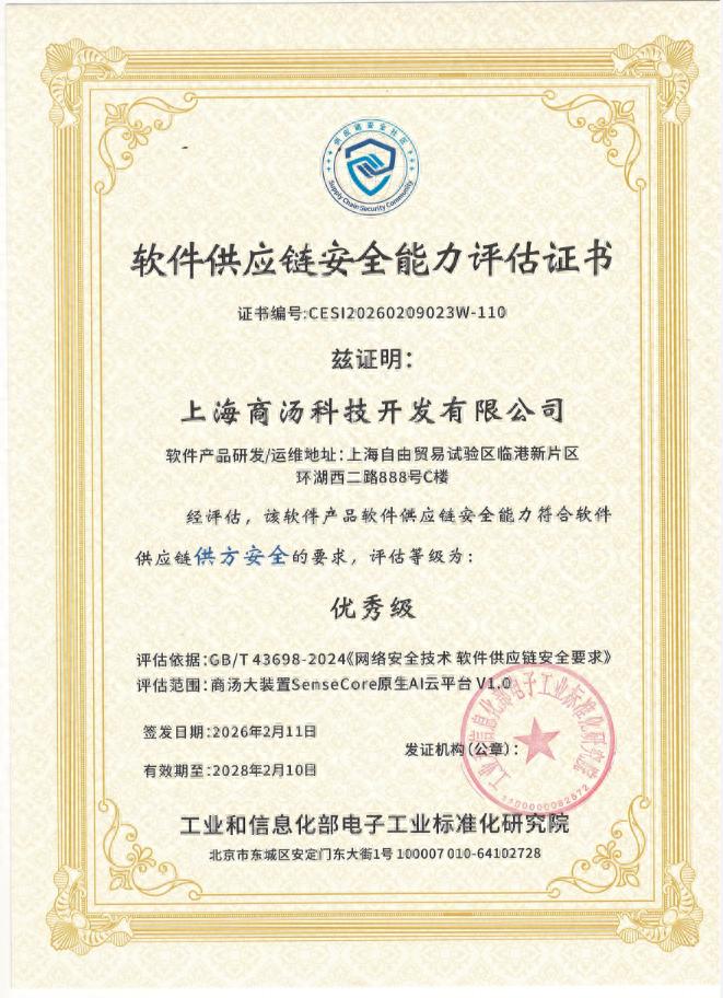 近期,商汤大装置SenseCore原生AI云平台通过工业和信息化部电子工业标准化研究院组织的软件供应链安全能力评估,获评优秀级,成为全国首批通过该项认证的企业。