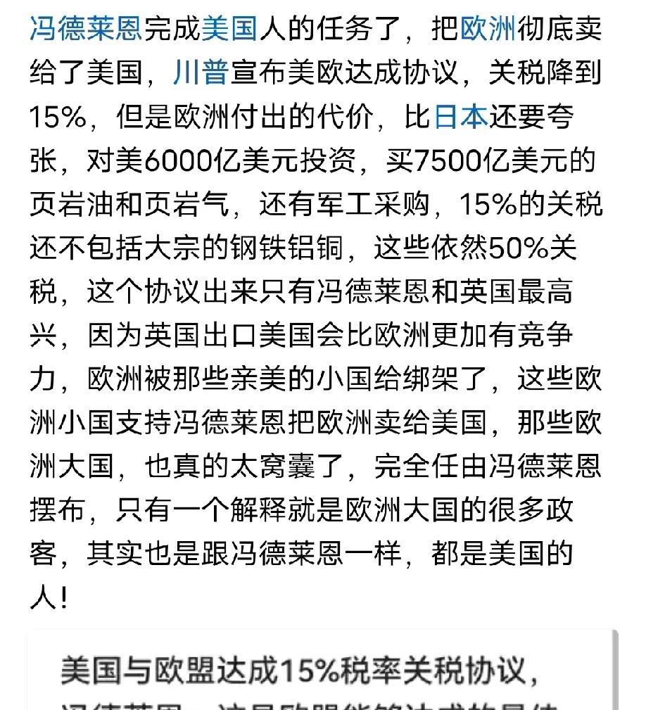 欧盟批冯德莱恩无权和川普达成6000亿美元的投资计划,也就是说投不投资美国那是欧洲企业自己意愿的事情,不是欧洲官方机构去投资美国,所以等于说6000亿美元的投资,其实也就是口头上答应的事情,具体落实情况,不知道,这跟日本其实差不多的,日本5500亿美元,听着挺多的,都是都是川普单方面宣布的,而且是在社交平台宣布,也没有什么官方签字或者什么文件,所以这些信息大概率就是川普给自己造势而已,之后的落实情况,根本就没有谁知道,就跟中东行,中东土豪答应的投资一样,一个比一个吓人的投资数据,也就热搜几天后,也没有下文了,到底投资了吗?没有人知道!