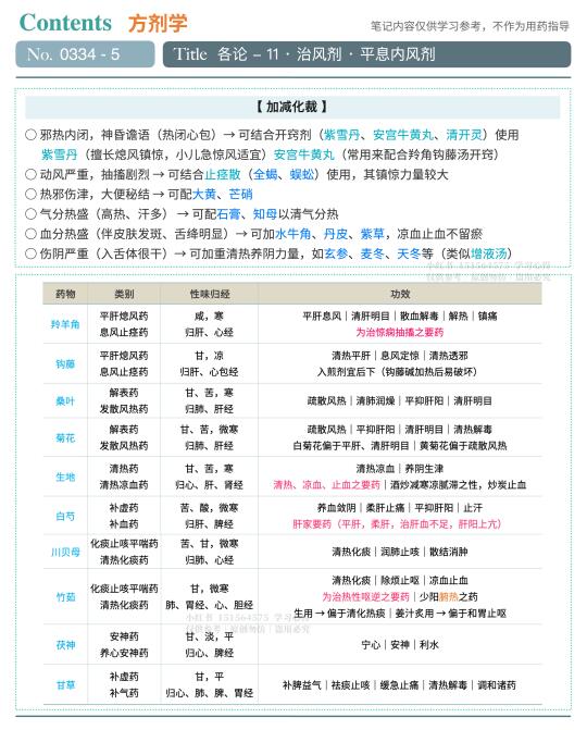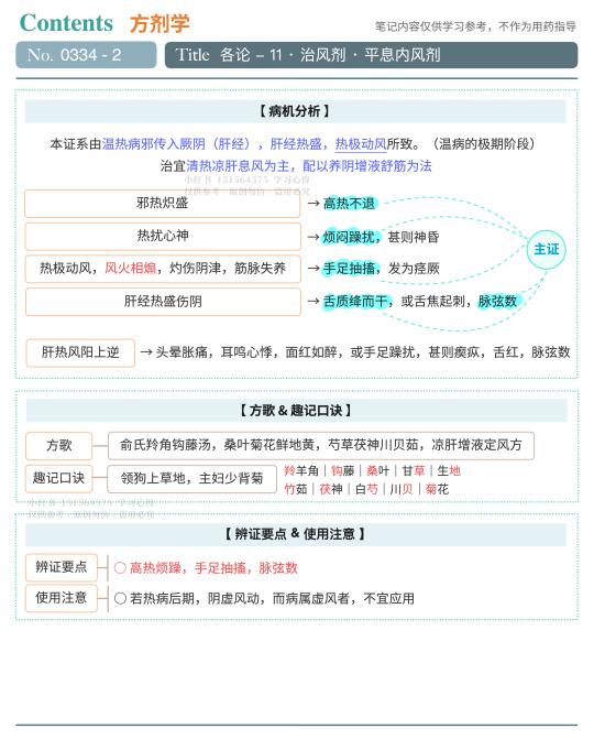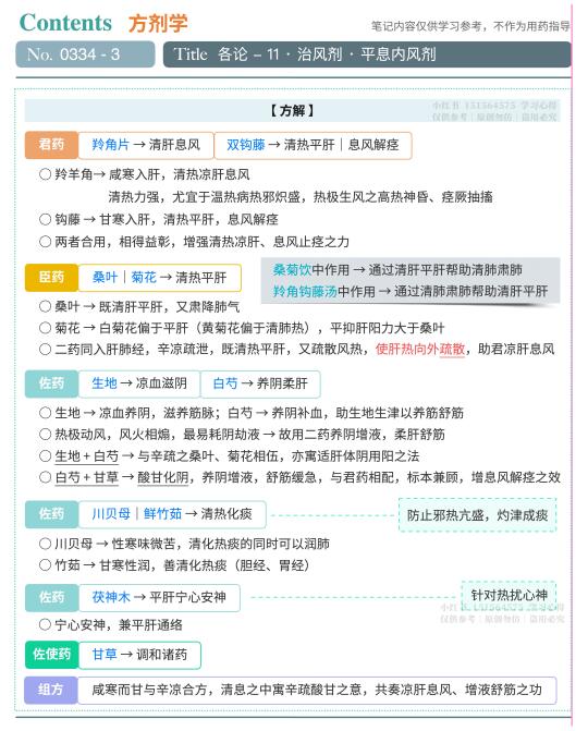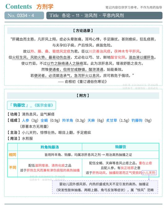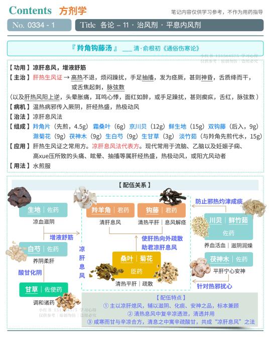 iPad无纸化学习 goodnotes ☀️前面几篇都是疏散外风的方剂,今天开始学学平息内风剂。那什么是外风什么是内风?简单直白的说就是: 🌬️外风= 外来的风邪(风寒风湿风热等) 🌬️内风= 内部脏腑功能失调而生出的风。 📝平息内风概括起来有几个方法:凉肝息风、镇肝息风、清热息风、滋阴息风。同样是息风,所对应针对的问题不同,解决方案自然不同。咱们先从凉肝息风的羚角钩藤汤开始哈~ 🍀🍀🍀羚角钩藤汤《通俗伤寒论》🍀🍀🍀 【 功用 】凉肝息风,增液舒筋 【 主治 】肝热生风证 → 高热不退,烦闷躁扰,手足抽搐,发为痉厥,甚则神昏,舌质绛而干,或舌焦起刺,脉弦数 【 病机 】温热病邪传入厥阴,肝经热盛,热极动风 【 治法 】凉肝息风法 【 应用 】肝热生风证之常用方。凉肝息风法代表方。现代常用于流nao、乙nao以及妊shen子痫、高xue压所致的头tong、眩晕、抽搐等属肝经热盛,热极动风,或阳亢风动者 【 用法 】水煎服 【 君药 】羚角片|双钩藤 【 臣药 】桑叶|菊花 【 佐药 】生地|白芍|川贝母|鲜竹茹|茯神木 【 佐使药 】甘草 【 特点 】① 主以凉肝熄风,辅以滋阴、化痰、安神之品,标本兼顾② 清热息风中复辛凉透泄,清透并用③ 咸寒而甘与辛凉合方,清息之中寓辛疏酸甘,共成“凉肝息风”之法 【 方歌 】俞氏羚角钩藤汤,桑叶菊花鲜地黄,芍草茯神川贝茹,凉肝增液定风方 【 趣味记忆 】领狗上草地,主妇少背菊 【 辨证要点 】高热烦躁,手足抽搐,脉弦数 【 使用注意 】热病后期,阴虚风动,而病属虚风者不宜 🔖🔖🔖 附方 🔖🔖🔖 【 钩藤饮 】清热息风,益气解痉 → 小儿天钓,惊悸壮热,眼目上翻,手足瘛疭 【 名词解释 】小儿天钓 → 婴幼儿因外感风邪、内热炽盛或先天不足引发的高热、抽搐证,属“惊风”范畴 【 鉴别 】羚角钩藤汤滋阴增液、清热化痰;钩藤饮重在止痉且,且扶正祛邪 ❣️❣️❣️ 名句摘抄 ❣️❣️❣️ ◉ “火旺生风,风助火势,最易动伤血液” ◉ “肝藏血而主筋,凡肝风上翔,症必头晕胀痛,耳鸣心悸,手足躁扰,甚则瘛疭,狂乱痉厥”