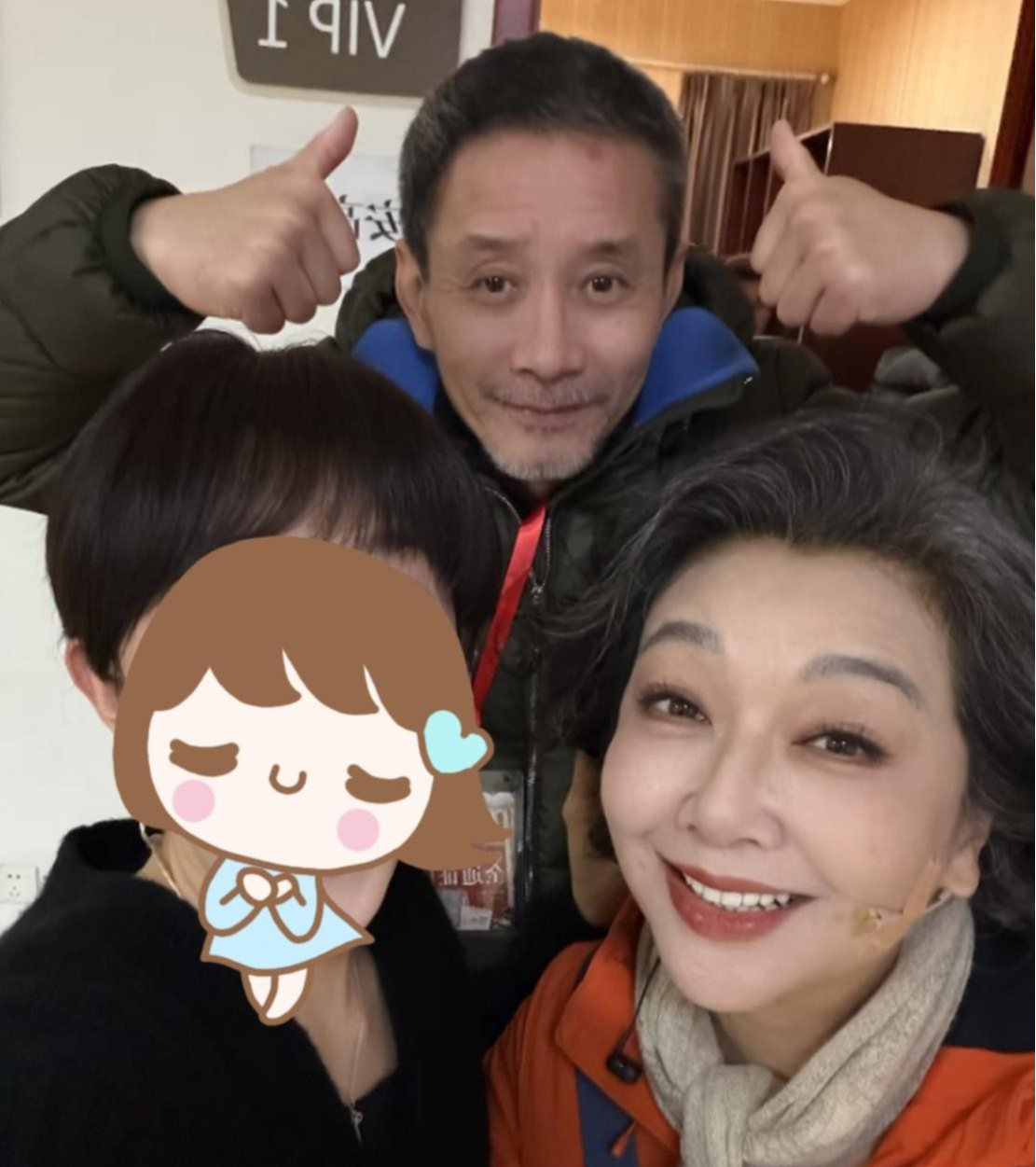 江珊和田小洁在《此生必驾》演出后台,三个人站一块儿笑。江珊59岁,穿着橙色连帽外套,腰线松松的,但笑得特别自然;田小洁56岁,胡子全白,工作证别在胸前,笑的时候眼角挤出好几道褶。旁边还有个年轻粉丝,比他俩都高半头。