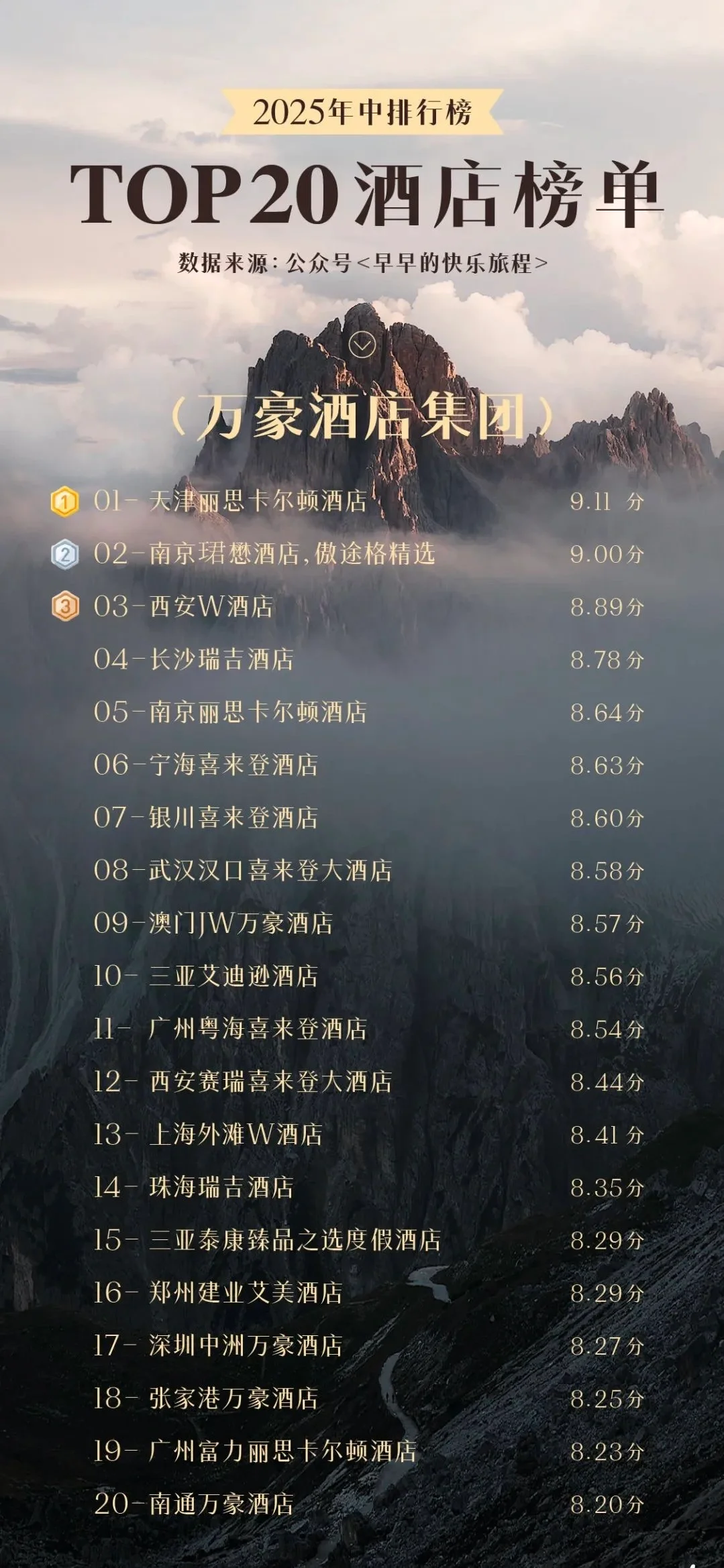 1. 前20的上榜门槛,从8.18升到了8.20,竞争还是比较激烈2. 天津丽思,从之前的8.88分,爬升到了9.11分,有点厉害,想去体验了
