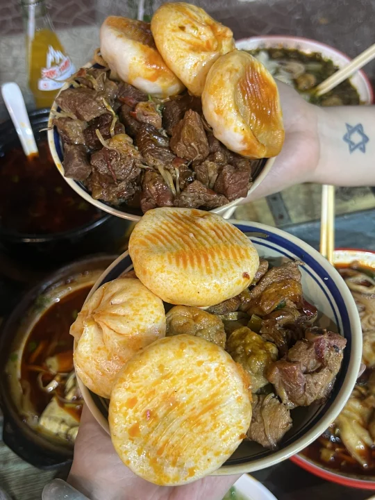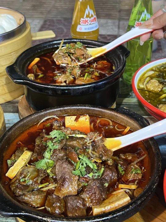 满满一锅,咸淡适中,牛肉切的很厚实,香料的味道巧妙点透出牛肉的本味,下面还有豆腐皮一些配菜,吃上一口身上味蕾美美的~