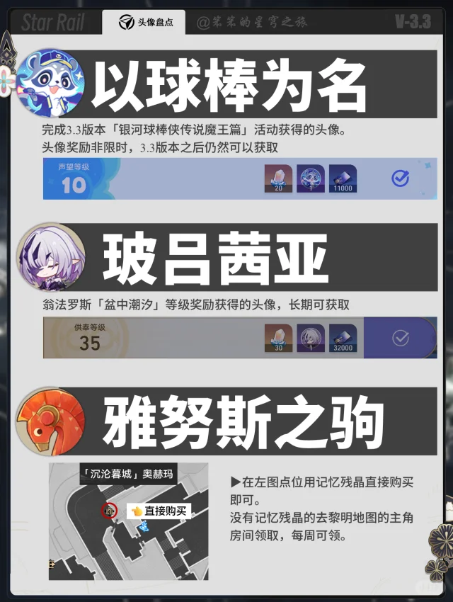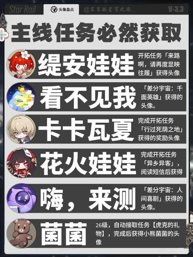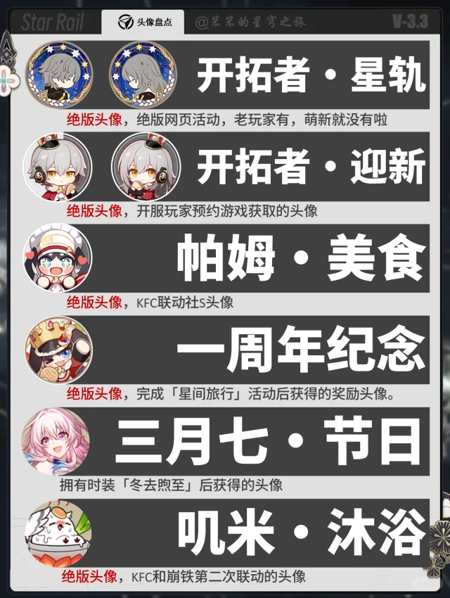 🐱大家好,我是笨笨 今天给大家带来的是 截止3.3版本崩铁所有特殊头像获取的攻略 最后的几个头像已经绝版 前面的头像都是可以获取的 还没获取的开拓者赶紧冲啊