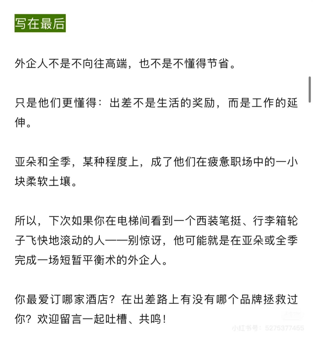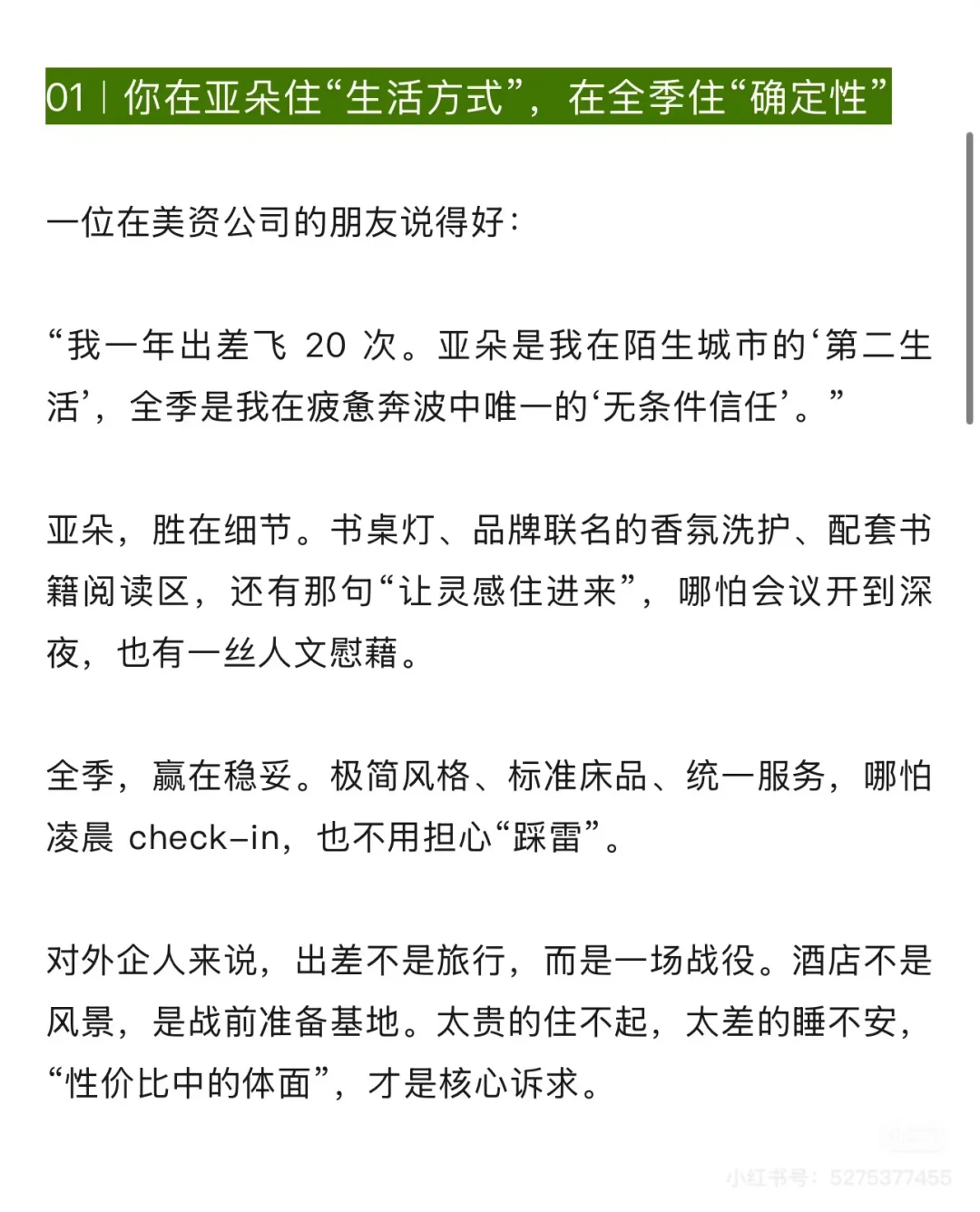 🔹最近刷到的一篇好文 🔹文字及图片均摘自公众号:外企也打卡 🔹经济下行 消费降级 🔸博主要考虑再开一个“玩转🏨亚朵全季” 🔸一直端着,底线是万枫雅乐轩智选假日,就是不住亚朵全季,虚伪![doge] 万豪旅享家、IHG优悦会们,你们真的开始住亚朵全季了吗?