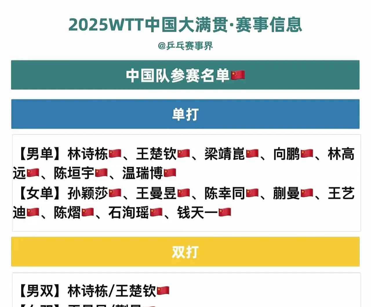 中国大满贯国乒直接亮了最强阵容!男单是小石头、大头、大胖、向鹏、陈垣宇、高远、温瑞博;女单这边,莎莎、曼昱、同同、蒯曼、大迪、陈熠、石询瑶、天一全在列;混双是莎莎和大头这对老搭档,男双则是大头配小石头,女双由曼昱搭档蒯曼。 秦志戬副主席说了,这次派最强阵容,就是要把中国大满贯这5项金牌全拿下,理由很实在。第一,在咱自己家门口比,天时地利人和全占着,夺冠的时机再合适不过。就说男单,之前在横滨有张本智和的本土气势搅局,在瑞典大满贯又有小莫占着天时地利人和,这次在家门口,没这些干扰,冠军肯定丢不了。男双也特意换了大头和小石头这对最强王牌组合,大头能带着小石头发挥得更猛,这冠军也稳得很。 第二,混双派莎莎和大头,这对可是公认的最强组合,不光金牌拿得稳,俩人搭档自带热度,流量也不用愁。 第三,女单、女双这边,咱有世界第一的王牌选手压阵,这两项冠军基本就是提前锁定了,现在最大的看点反倒是最后谁能拿冠军。 中国大满贯在自己家门口办,队员们不用倒时差,球和球桌也都是熟悉的,对国乒选手来说太有利了。这一战,金牌咱们志在必得!国乒,加油!