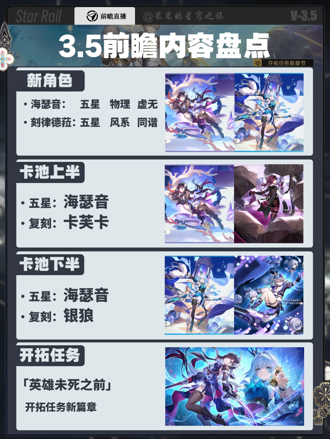 🐱大家好,我是笨笨的铲屎官 3.5版本前瞻信息来了 ①卡池: 上半:海瑟音(物理虚无)卡芙卡复刻 下半:刻律德菈(风同谐)银狼复刻 大活动:黄金迷境大饭店(送四星同谐光锥) 小活动:调酒 小活动:空间站特派