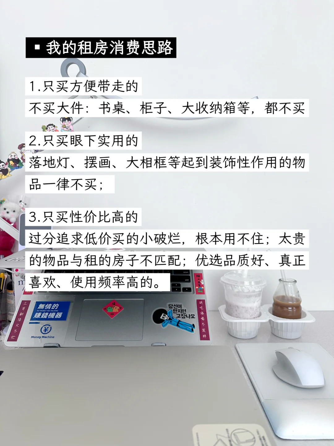 马上就要搬进新房了,我一点也不为搬家发愁,因为我的租房生活始终秉持:能代替的不买、大件不买、当下用不上的不买,保持随时跑路风,极简少物生活,搬家真的一点也不累~ 🟡盘点我觉得出租房里不该买的物品清单: 1.不买收纳:租房的尽头是物尽其用 省钱思路:外包装二次利用 2.不买太多锅 3.不买太多餐具 4.不买衣物收纳箱 5.不买装饰/改造出租屋的东西 6.不买实体书 🟠我的租房消费思路: 1.只买方便带走的 不买大件:书桌、柜子、大收纳箱等,都不买; 2.只买眼下实用的 落地灯、摆画、大相框等起到装饰性作用的物品一律不买; 3.只买性价比高的 过分追求低价买的小破烂,根本用不住;太贵的物品与租的房子不匹配;优选品质好、真正喜欢、使用频率高的。 我是小哈娜,分享简单生活和精致好物。 谢谢你的时间,下次见~