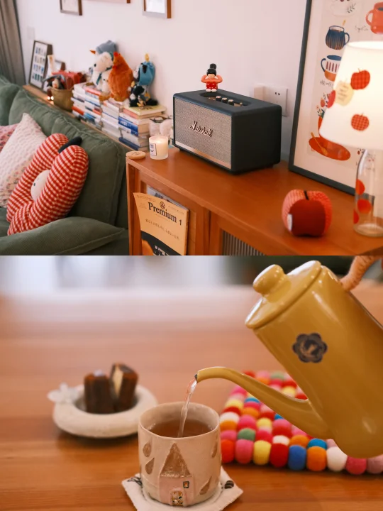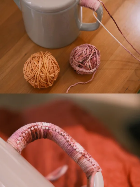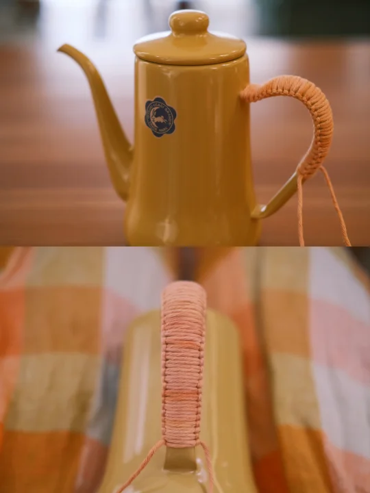 立秋过后喝茶的频率就变高了 于是又拥有了新壶~ 用两团植物染棉线给珐琅壶缠上了防烫把手 一下就有秋天的感觉啦
