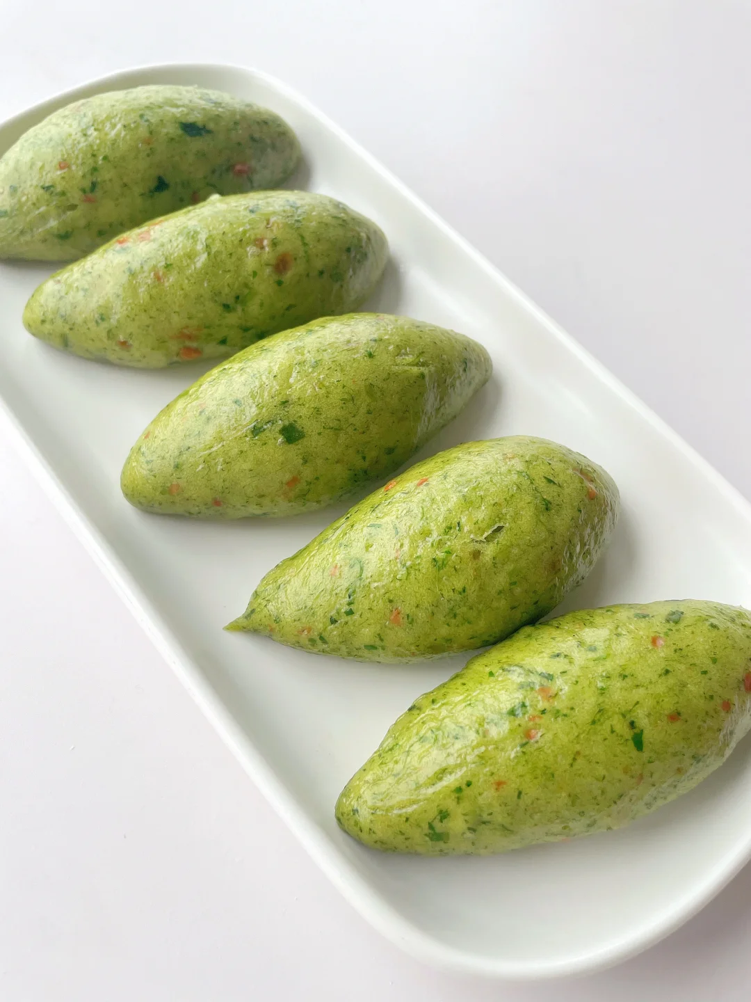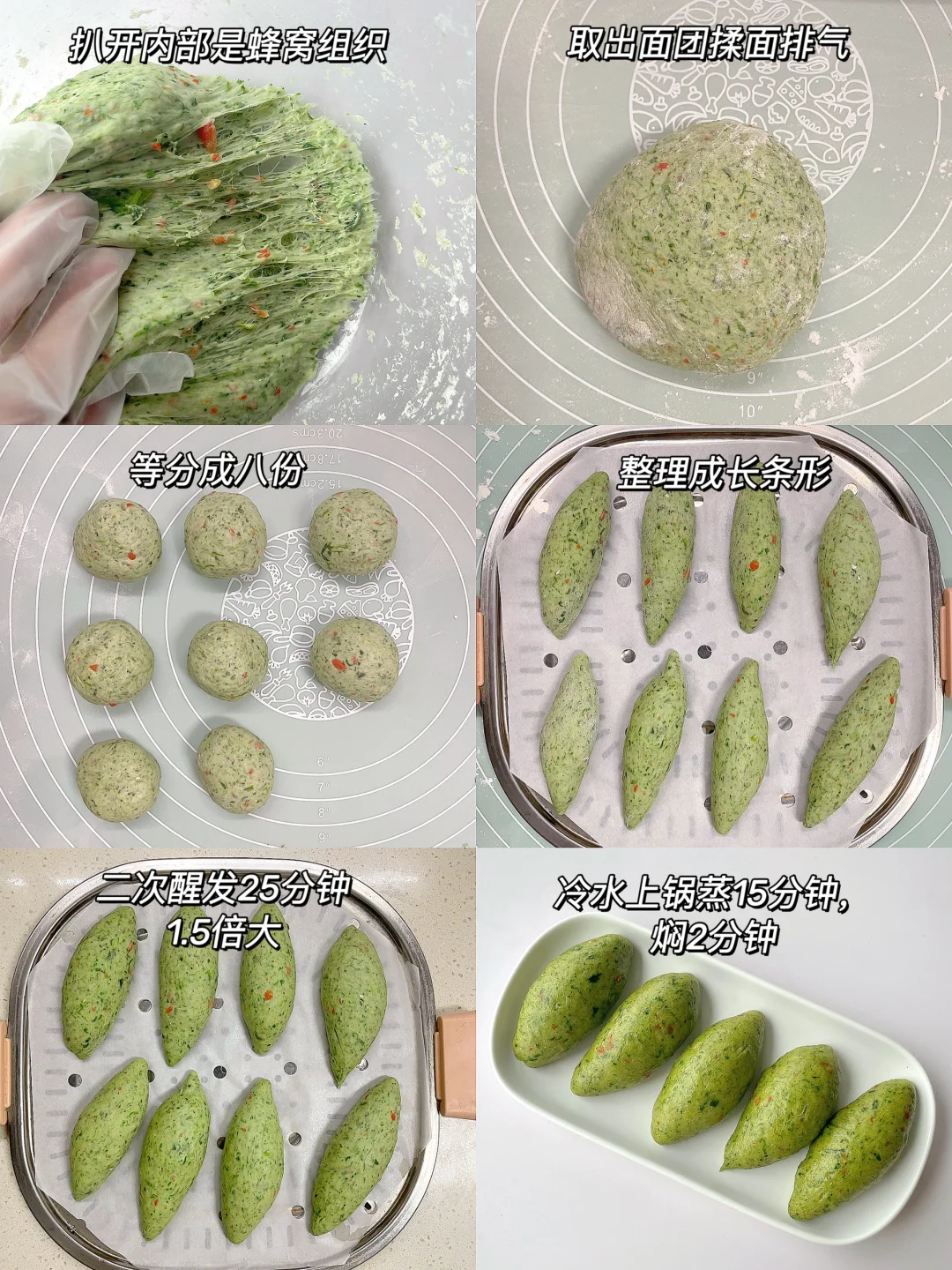 🌈正是吃青团的好时节,给宝宝安排一款“青团”馒头吧~ 🎈准备食材: 1️⃣菠菜和胡萝卜适量,面粉100克,酵母1克,温水50克; 🎈制作步骤: 1️⃣蔬菜焯水后挤干切碎备用,面粉、酵母混合均匀,倒入50克温水搅拌成絮状,揉成面团; 2️⃣密封醒10分钟,揉成光滑的面团,然后密封醒发至两倍大(30度50分钟),扒开看里面有蜂窝状组织; 3️⃣取出面团揉面排气,等分成8份,整理成中间粗两段细的长条形,放入蒸笼二次醒发25分钟左右,变为1.5倍大; 4️⃣冷水开火蒸15分钟,闷2分钟即可~